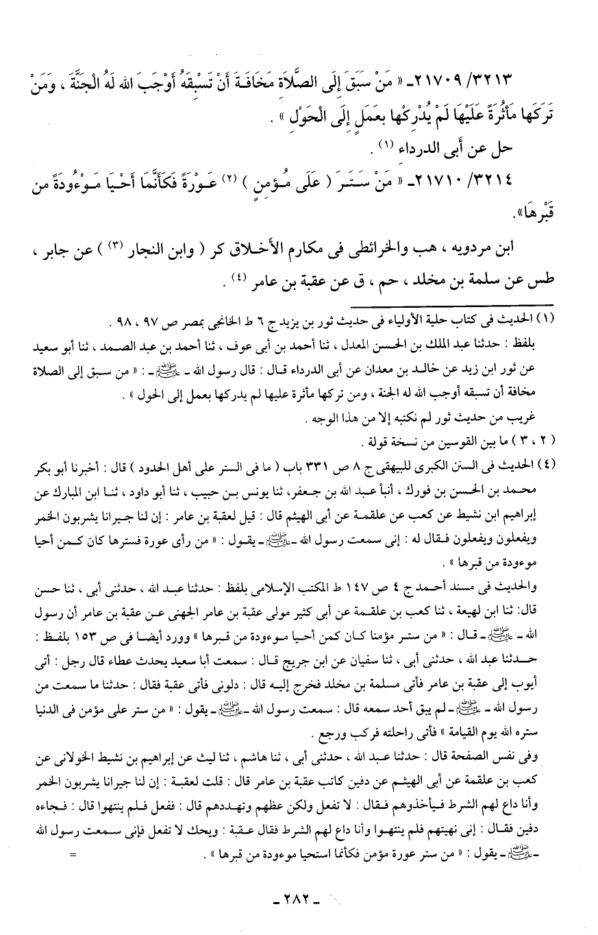 (¬4) الحديث في السنن الكبرى للبيهقي ج 8 ص 331 باب (ما في الستر على أهل الحدود) قال: أخبرنا أبو بكر محمد بن الحسن بن فورك، أنبأ عبد الله بن جعفر، ثنا يونس بن حبيب، ثنا أبو داود، ثنا ابن المبارك عن إبراهيم بن نشيط عن كعب عن علقمة عن أبي الهيثم قال: قيل لعقبة بن عامر: إن لنا جيرانا يشربون الخمر ويفعلون ويفعلون فقال له: إني سمعت رسول الله - صلى الله عليه وسلم - يقول: "من رأى عورة فسترها كان كمن أحيا موءودة من قبرها".