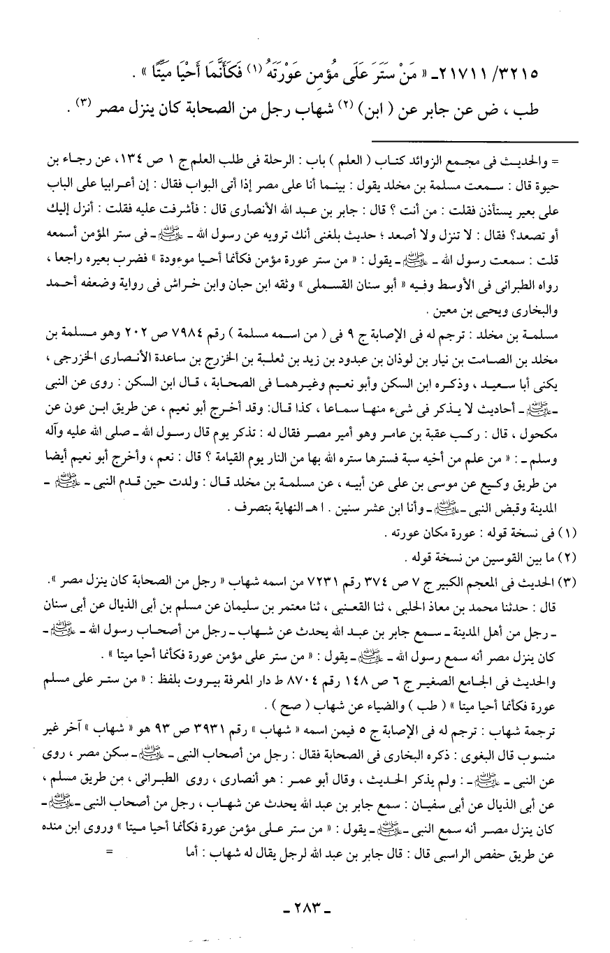 3215/ 21711 - "مَنْ سَتَرَ عَلَى مُؤمِنٍ عَوْرَتَهُ (¬1) فَكَأَنَّمَا أَحْيَا مَيِّتًا".