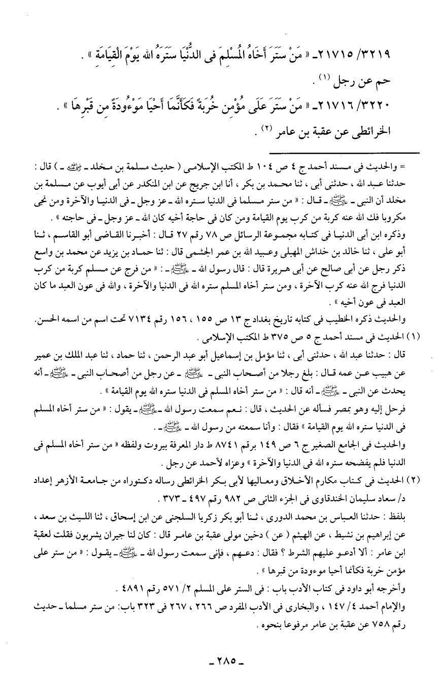 3219/ 21715 - "مَنْ سَتَرَ أَخَاهُ المُسْلِمَ في الدُّنْيَا سَتَرَهُ الله يَوْمَ الْقِيَامَةِ".