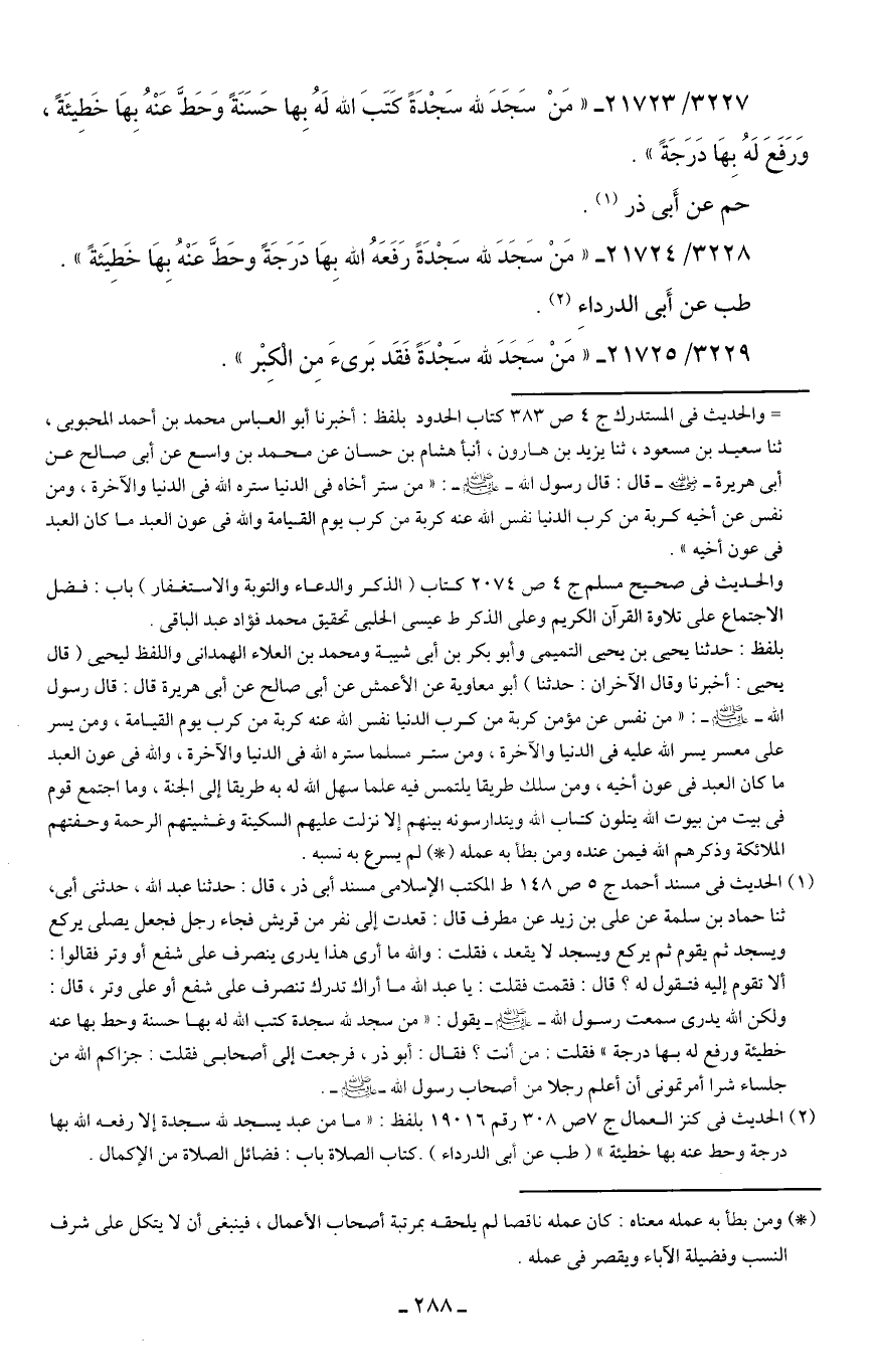 3228/ 21724 - "مَنْ سَجَدَ لله سَجْدَةً رَفَعَهُ الله بِهَا دَرَجَةً وحَطَّ عَنْهُ بِهَا خَطيَئةً".