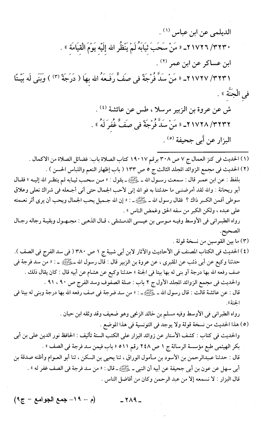 (¬4) الحديث في الكتاب المصنف في الأحاديث والآثار لابن أبي شيبة ج 1 ص 380 (في سد الفرج في الصف). حدثنا وكيع عن أبي ذئب عن المقبري، عن عروة بن الزبير قال: قال رسول الله - صلى الله عليه وسلم -: "من سد فرجة في صف رفعه الله بها درجة أو بنى له بها بيتنا في الجنة "حدثنا وكيع عن هشام عن أبيه قال: كان يقال ذلك.