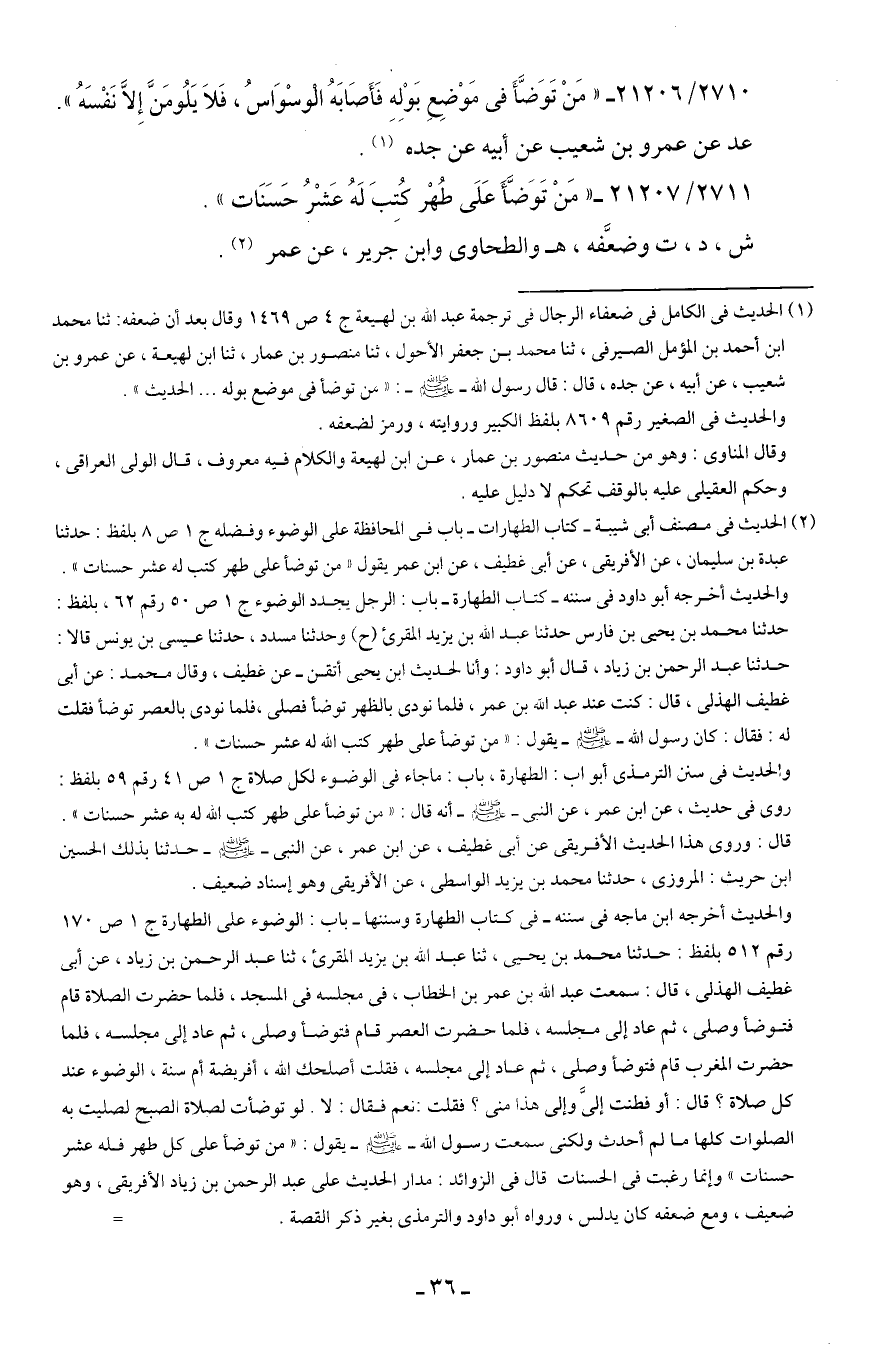 (¬2) الحديث في مصنف أبي شيبة -كتاب الطهارات- باب في المحافظة علي الوضوء وفضله ج 1 ص 8 بلفظ: حدثنا عبدة بن سليمان، عن الأفريقي، عن أبي غطيف، عن ابن عمر يقول "من توضأ علي طهر كتب له عشر حسنات".