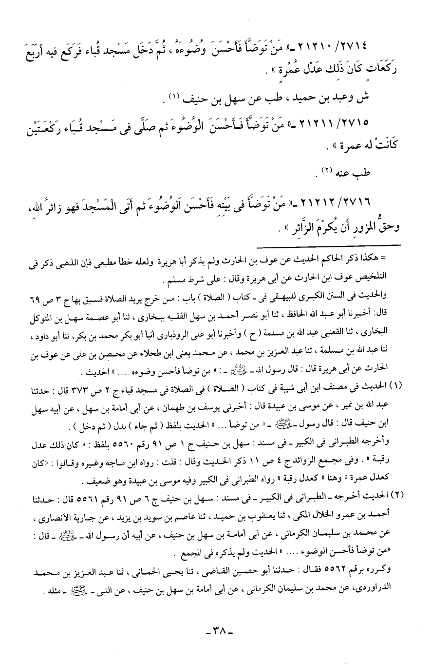 2714/ 21210 - "مَنْ تَوَضَّأَ فَأَحْسَنَ وُضُوءَهُ، ثُمَّ دَخَل مَسْجد قُباء فَرَكَع فيه أَرَبَعَ رَكَعَاتٍ كَانَ ذَلِك عدْل عُمْرةٍ".
