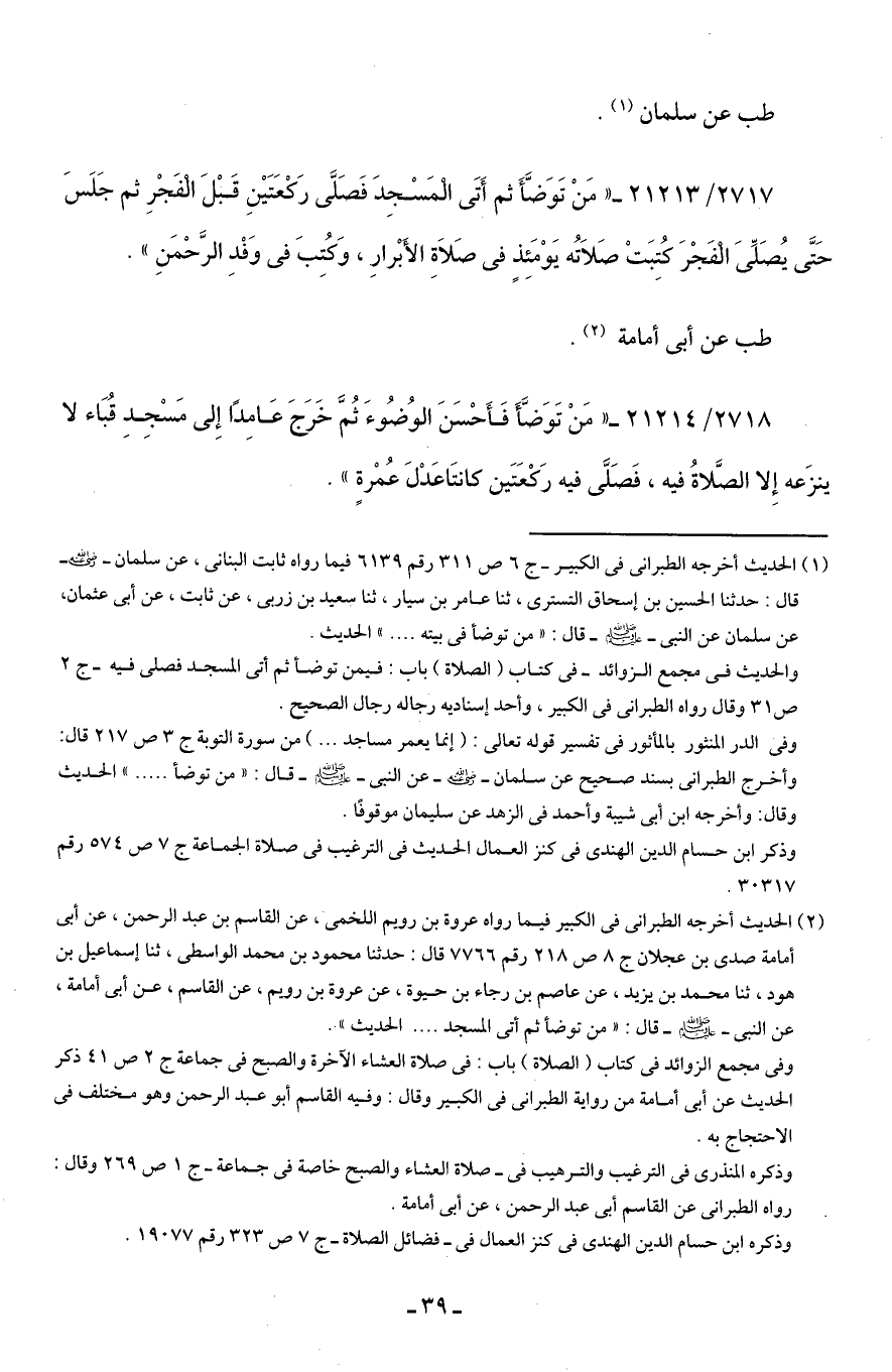 2718/ 21214 - "مَنْ تَوَضَّأَ فَأَحْسَنَ الوُضُوءَ ثُمَّ خَرَجَ عَامِدًا إِلى مَسْجِدِ قُبَاء لا ينزَعه إِلا الصَّلاةُ فيه، فَصَلَّى فيه رَكْعَتَين كانتَا عَدْلَ عُمْرةٍ".