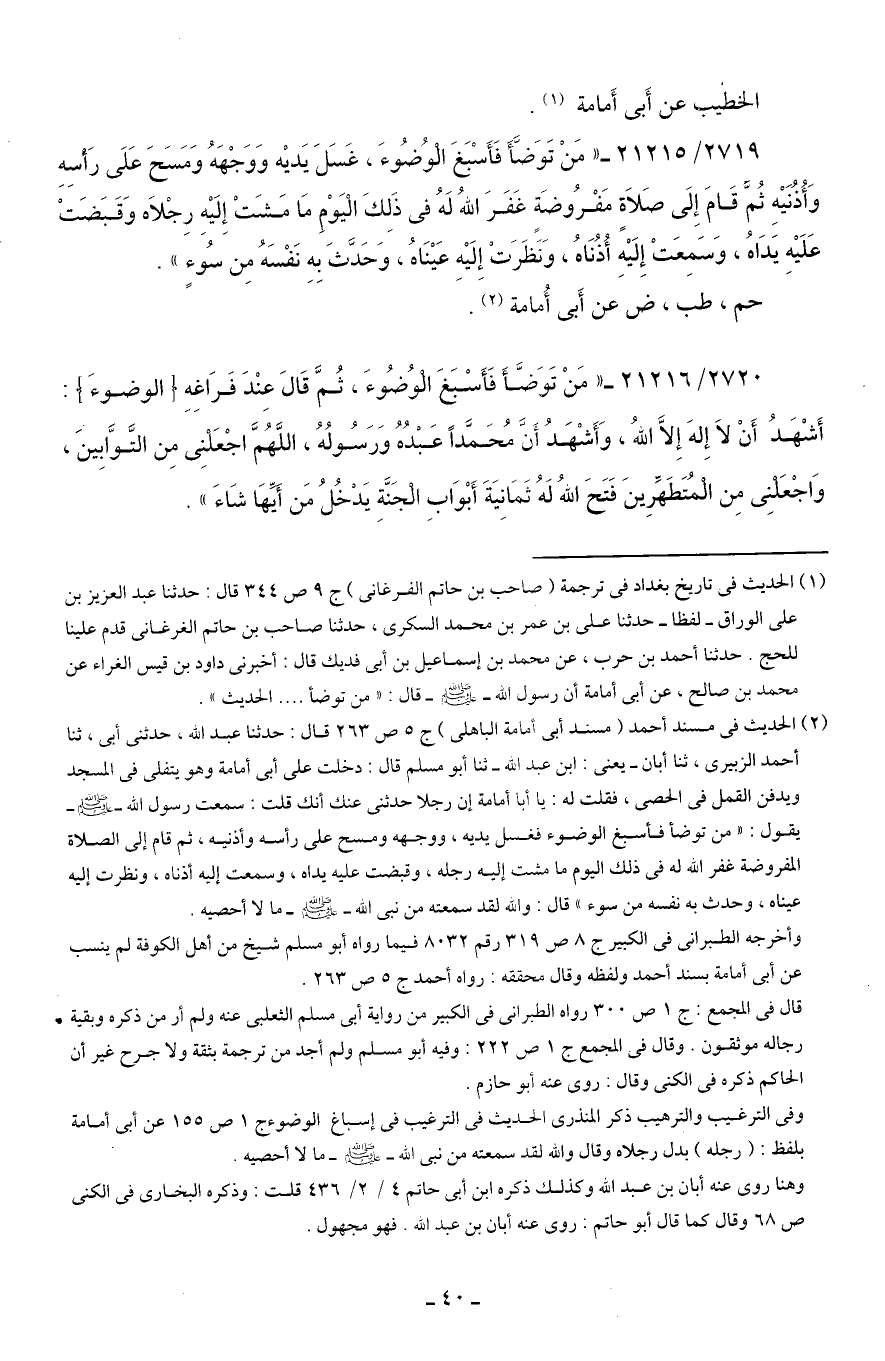 (¬1) الحديث في تاريخ بغداد في ترجمة (صاحب بن حاتم الفرغاني) ج 9 ص 344 قال: حدثنا عبد العزيز بن علي الوراق -لفظا- حدثنا علي بن عمر بن محمد السكري، حدثنا صاحب بن حاتم الفرغاني قدم علينا للحج. حدثنا أحمد بن حرب، عن محمد بن إسماعيل بن أبي فديك قال: أخبرني داود بن قيس الغراء عن محمد بن صالح، عن أبي أمامة أن رسول الله - صلى الله عليه وسلم - قال: "من توضأ .... الحديث".