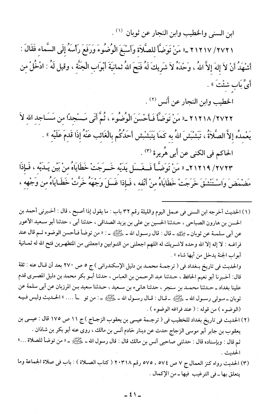 2721/ 21217 - "مَنْ تَوَضَّأَ لِلصَّلاةِ وَأَسْبَغَ الْوُضُوءَ وَرَفَعَ رَأسَهُ إِلَى السَّماءِ فَقَال: أَشْهَدُ أَنْ لَا إِلهَ إلا اللهُ، وَحْدَهُ لَا شَرِيكَ لَهُ فَتَحَ اللهُ ثمانِيَةَ أَبْوَابِ الْجَنَّةِ، وقيل لَهُ: ادْخُلْ مِن أَيِّ بَابٍ شِئْتَ".