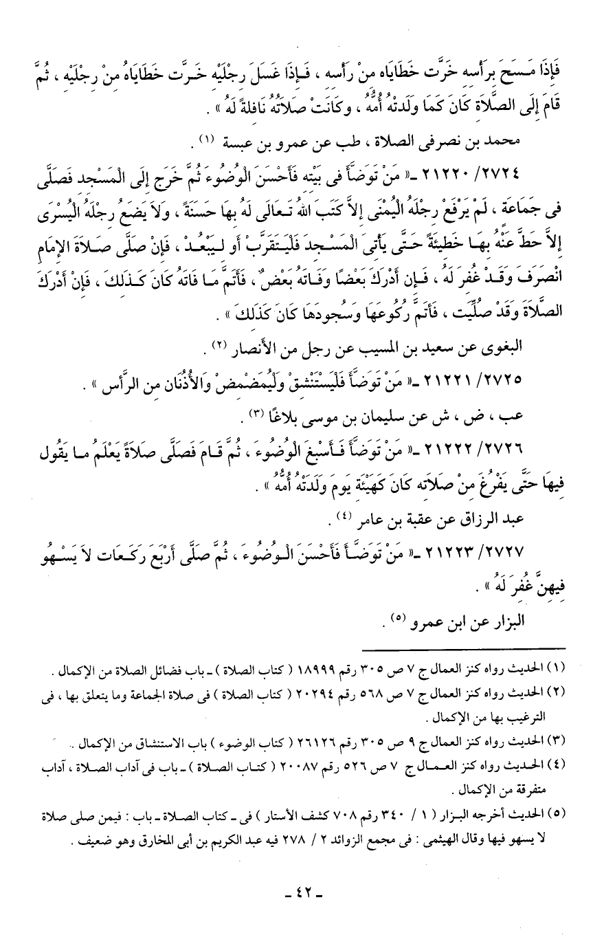2726/ 21222 - "مَنْ تَوَضَّأَ فَأَسْبغَ الْوُضُوءَ، ثُمَّ قَامَ فَصَلَّى صَلاةً يَعْلَمُ ما يَقُول فِيهَا حَتَّى يَفْرُغَ مِنْ صَلاتِه كَانَ كَهَيئَةِ يَومَ وَلَدَتْهُ أُمُّهُ".