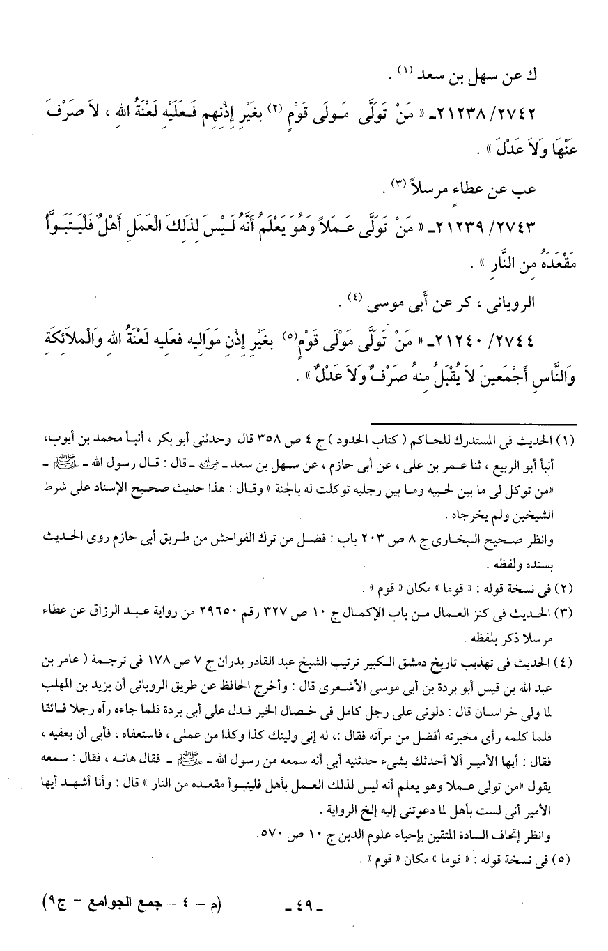 2744/ 21240 - "مَنْ تَوَلَّى مَوْلَى قَوْمٍ (¬5) بغَيرِ إِذْنِ مَوَالِيه فعَلِيه لَعْنَة اللهِ وَالْملائِكَةِ وَالنَّاسِ أَجْمَعينَ لَا يُقْبَلُ مِنهُ صَرْفٌ وَلَا عَدْلٌ".