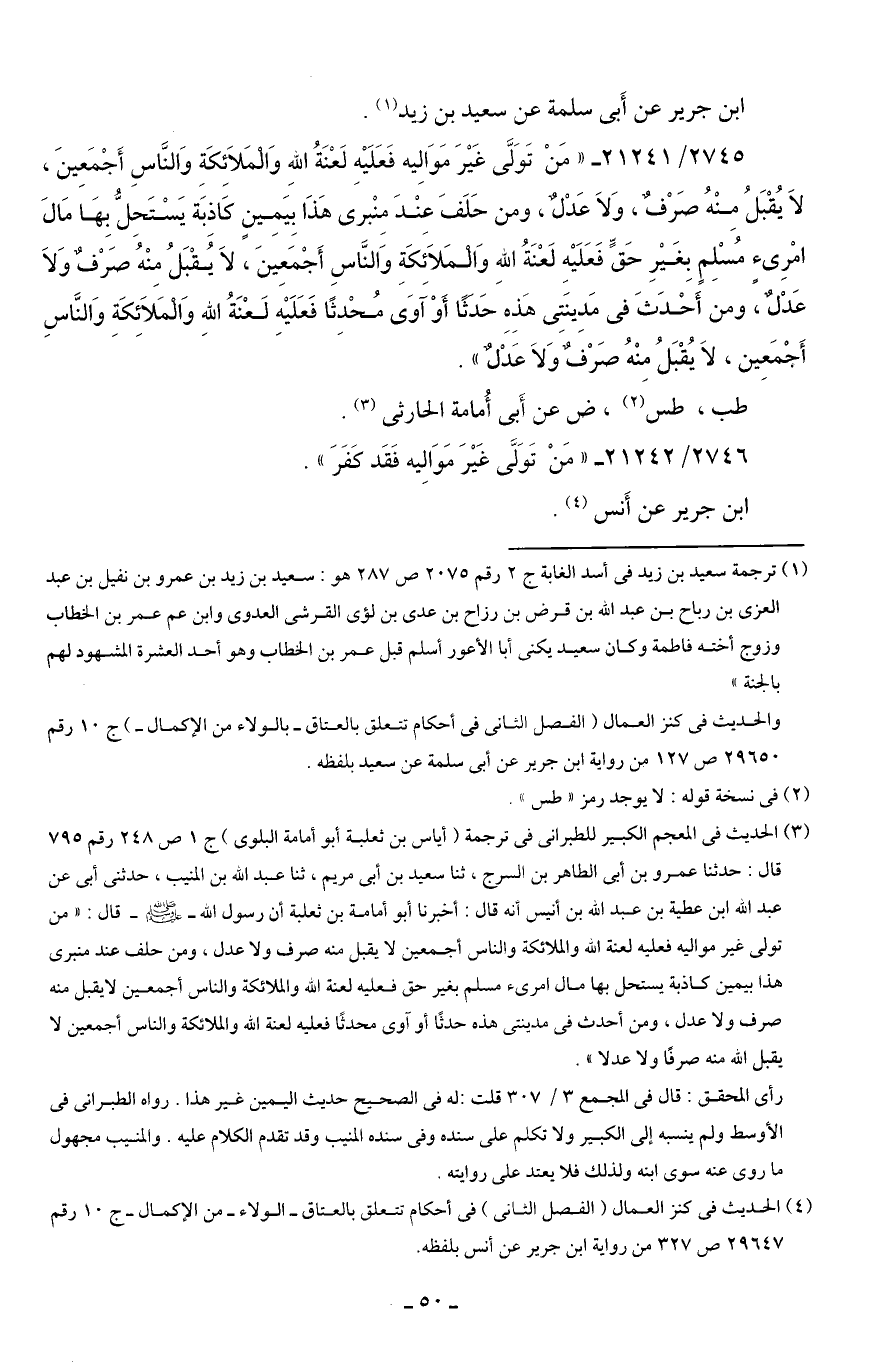 2745/ 21241 - "مَنْ تَوَلَّى غَيرَ مَوَالِيه فَعَلَيهِ لَعْنَةُ اللهِ وَالْمَلَائِكَةِ وَالنَّاسِ أَجْمَعِينَ، لَا يُقْبَلُ مِنْهُ صَرْفٌ، وَلَا عَدْلٌ، ومن حَلَفَ عِنْدَ مِنْبري هَذَا بِيَمِينٍ كَاذِبَةٍ يَسْتَحِلُّ بِهَا مَالَ امْرِئٍ مُسْلِمٍ بِغَيرِ حَقٍّ فَعَلَيهِ لَعْنَةُ اللهِ وَالْمَلَائِكَةِ وَالنَّاسِ أَجْمَعِينَ، لَا يُقْبَلُ منْهُ صَرْفٌ وَلَا عَدْلٌ، ومن أَحْدَثَ في مَدِينَتِي هَذِهِ حَدَثًا أَوْ آوَى مُحْدِثًا فَعَلَيهِ لَعْنَةُ اللهِ وَالْمَلَائِكَةِ وَالنَّاسِ أَجْمَعِين، لَا يُقْبَلُ مِنْهُ صَرْفٌ وَلَا عَدْلٌ".