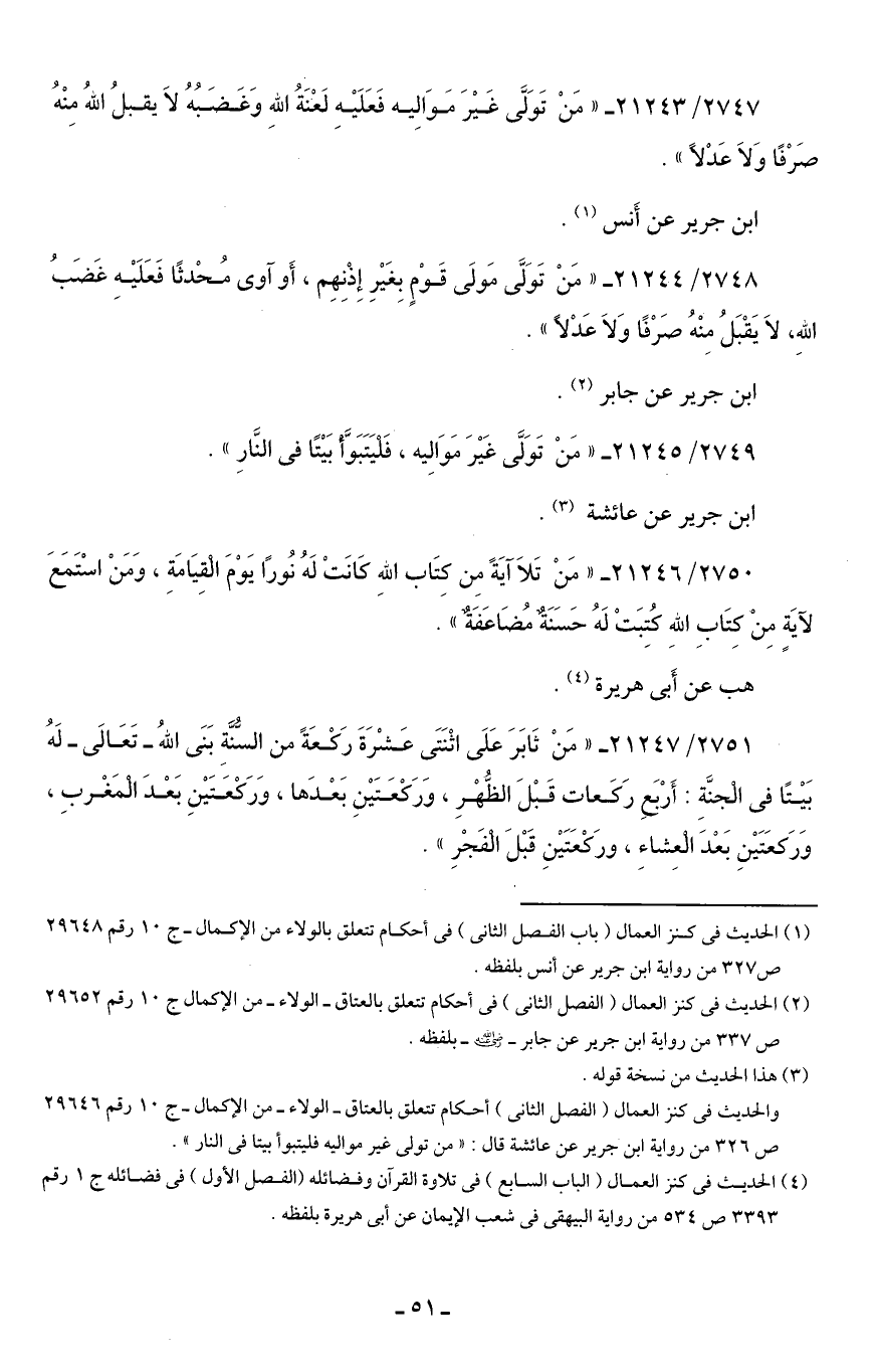 2747/ 21243 - "مَنْ تَوَلَّى غَيرَ مَوَالِيه فَعَلَيهِ لَعْنَةُ اللهِ وَغَضَبُهُ لَا يقبلُ اللهُ مِنْهُ صَرْفًا وَلَا عَدْلًا".