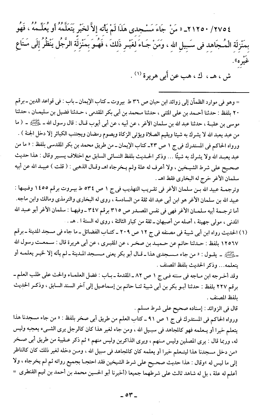 2754/ 21250 - "مَنْ جَاءَ مَسْجِدِي هَذَا لَمْ يَأْتِه إلا لِخَيرٍ يَتَعَلَّمُهُ أَو يُعَلِّمُهُ، فَهُو بِمَنْزِلَةِ الْمُجَاهِدِ في سَبِيلِ اللهِ، وَمَنْ جَاءَ لِغَيرِ ذَلِكَ، فَهُوَ بِمَنْزِلَةِ الرَّجُل يَنْظُرُ إِلَى مَتَاعِ غَيرِهِ".