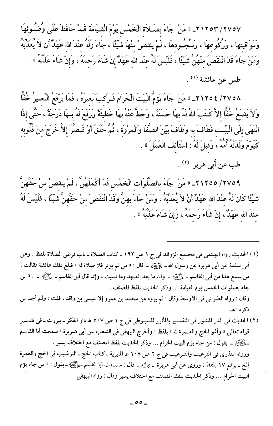 2759/ 21255 - "مَنْ جَاءَ بِالصَّلَوَاتِ الْخَمْسِ قَدْ أَكْمَلَهُنَّ، لَمْ ينقِصْ مِنْ حَقِّهِنَّ شَيئًا كَانَ لَهُ عِنْدَ اللهِ عَهْدٌ أَنْ لَا يُعَذِّبَهُ، وَمَنْ جَاءَ بِهِنَّ وَقَدْ انْتَقَصَ مِنْ حَقِّهِنَّ شَيئًا، فَلَيسَ لَهُ عِنْدَ اللهِ عَهْدٌ، إِنْ شَاءَ رَحِمَهُ، وَإِنْ شَاءَ عَذَّبَهُ".