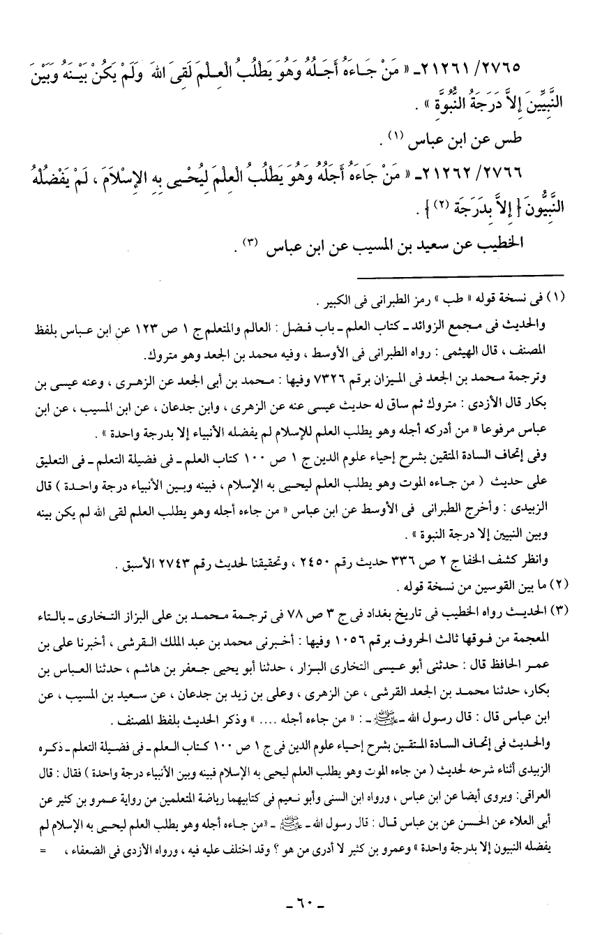 2766/ 21262 - "مَنْ جَاءَهُ أَجَلُهُ وَهُوَ يَطْلُبُ الْعِلْمَ ليُحْيي بِهِ الإِسْلَامَ، لَمْ يَفْضُلْهُ النَّبِيُّونَ {إلا بِدَرَجَة (¬2)}.