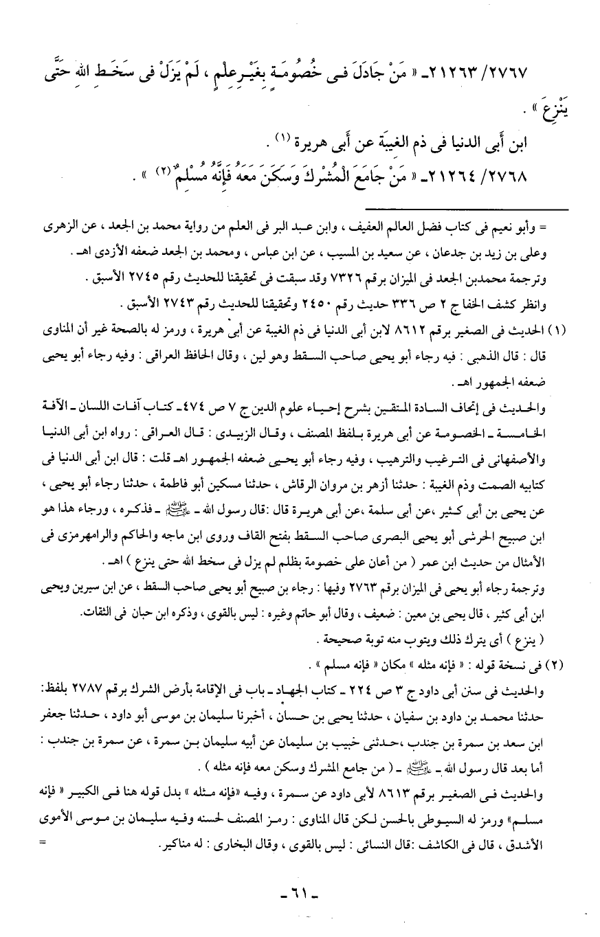 وانظر كشف الخفا ج 2 ص 336 حديث رقم 2450 وتحقيقنا للحديث رقم 2743 الأسبق.
