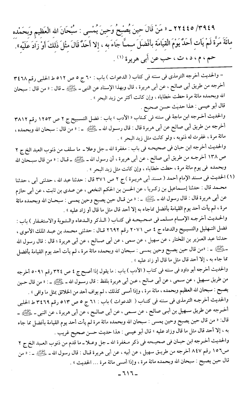 والحديث أخرجه الترمذي في سننه في كتاب (الدعوات) باب 610 ج 5 ص 513 رقم 3469 ط الحلبى أخرجه عن طريق سهيل بن أبي صالح، عن سمى، عن أبي صالح، عن أبي هريرة، عن النبي - صلى الله عليه وسلم - قال: "من قال حين يصبح وحين يمسى: سبحان الله وبحمده مائة مرة لم يأت أحد يوم القيامة بأفضل مما جاء به، إلا أحد قال مثل ما قال وزاد عليه" قال أبو عيسى. هذا حديث حسن صحيح غريب.