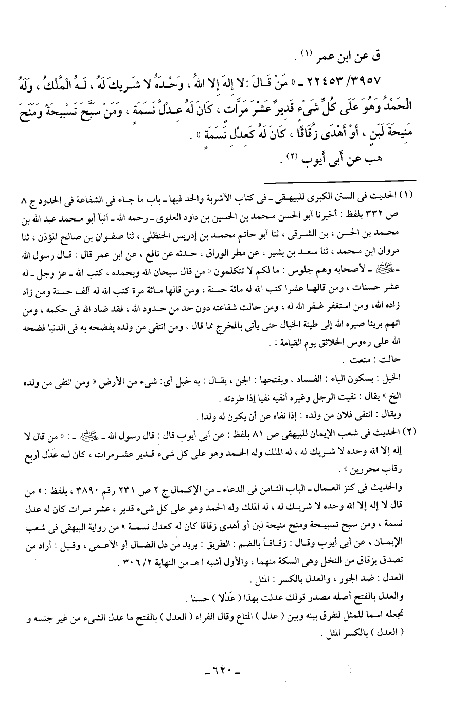 (¬2) الحديث في شعب الإيمان للبيهقي ص 81 بلفظ: عن أبي أيوب قال: قال رسول الله - صَلَّى الله عليه وسلم -: "من قال لا إله إلا الله وحده لا شريك له، له الملك وله الحمد وهو على كل شيء قدير عشر مرات، كان له عَدْل أربع رقاب محررين".