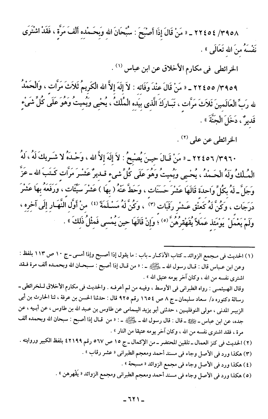 وقال الهيثمي: رواه الطبراني في الأوسط, وفيه من لم أعرفه. والحديث في مكارم الأخلاق للخرائطى -رسالة دكتوره د / سعاد سليمان- ج 8 ص 1654 رقم 925 قال: حدثنا الحسن بن عرفة، ثنا الحارث بن أبي الزبير المدني، مولى النوفليين، حدثني أبو يزيد اليمامى عن طاوس بن عبد الله بن طاوس، عن أبيه، عن جده، عن ابن عباس -رضي الله عنهما- قال: قال رسول الله - صَلَّى الله عليه وسلم -: "من قال إذا أصبح: سبحان الله وبحمده ألف مرة، فقد اشترى نفسه من الله، وكان آخر يومه عتيقا من النار".