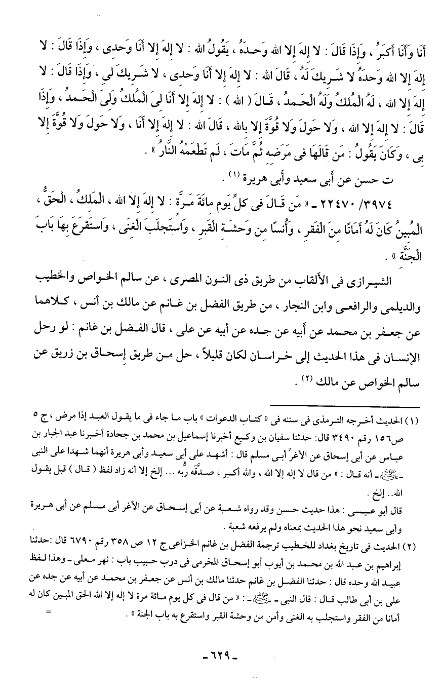 (¬2) الحديث في تاريخ بغداد للخطيب ترجمة الفضل بن غانم الخزاعي ج 12 ص 358 رقم 6790 قال: حدثنا إبراهيم بن عبد الله بن محمد بن أيوب أبو إسحاق المخرمي في درب حبيب باب: نهر معلى - وهذا لفظ عبيد الله وحده قال: حدثنا الفضل بن غانم حدثنا مالك بن أنس عن جعفر بن محمد عن أبيه عن جده عن علي بن أبي طالب قال: قال النبي - صَلَّى الله عليه وسلم -: "من قال في كل يوم مائة مرة لا إله إلا الله الحق المبين كان له أمانا من الفقر واستجلب به الغنى وأمن من وحشة القبر واستقرع به باب الجنة". =
