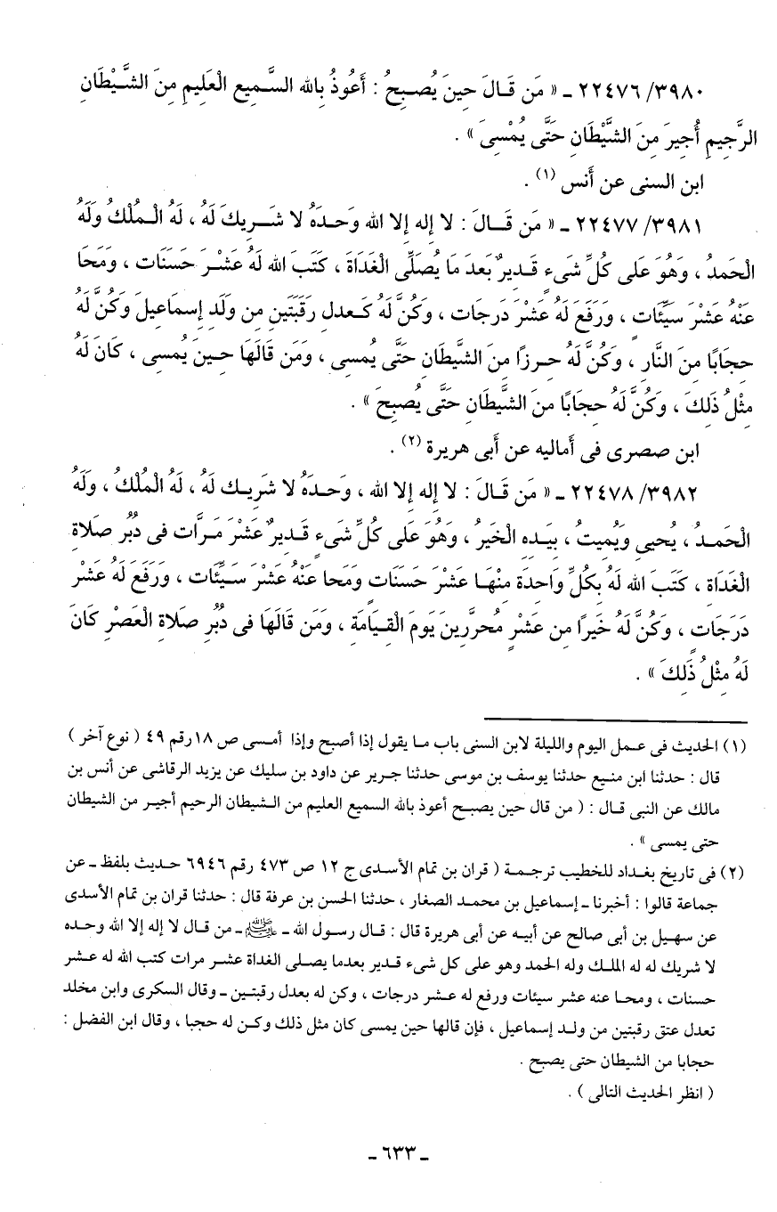 3981/ 22477 - "مَن قَال: لا إِله إِلا الله وَحدَهُ لا شَرِيكَ لَهُ، لَهُ الْمُلْكُ وَلَهُ الْحَمدُ، وَهُوَ عَلى كُلِّ شَيءٍ قَدِيرٌ بَعدَ مَا يُصَلِّي الْغَدَاةَ، كَتَبَ الله لَهُ عَشْرَ حَسَنَات، وَمَحَا عَنْهُ عَشْرَ سَيِّئَاتٍ، وَرَفَعَ لَهُ عَشْرَ دَرجَات، وَكُنَّ لَهُ كَعدلِ رَقَبَتَينِ مِن وَلَدِ إِسمَاعِيلَ وَكُنَّ لَهُ حِجَابًا مِنَ النَّارِ، وَكُنَّ لَهُ حِرزًا مِنَ الشَّيطَانِ حَتَّى يُمسِي، وَمَن قَالهَا حِينَ يُمسِي، كَانَ لَهُ مِثْلُ ذَلِكَ، وَكُنَّ لَهُ حِجَابًا منَ الشَّيطَانِ حَتَّى يُصبِحَ".