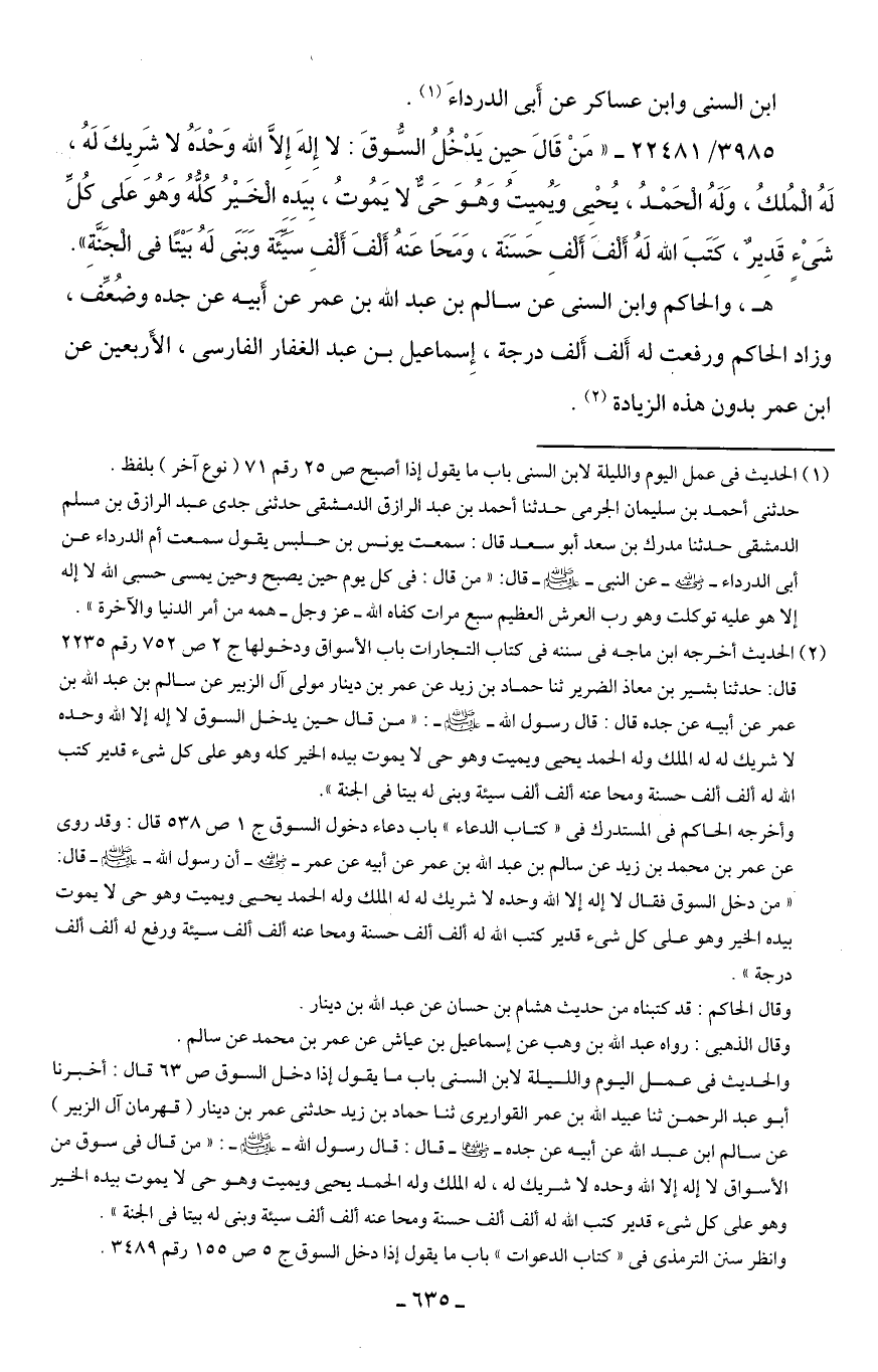 3985/ 22481 - "مَنْ قَال حِين يَدْخُلُ السُّوقَ: لا إِلهَ إلا الله وَحْدَهُ لا شَرِيكَ لَهُ، لَهُ الْمُلكُ، وَلَهُ الْحَمْدُ، يُحْيِي وَيُمِيتُ وَهُوَ حَيٌّ لا يَمُوتُ، بِيَدِهِ الْخَيرُ كُلُّهُ وَهُوَ عَلى كُلِّ شَيْءٍ قَدِيرٌ، كَتَبَ الله لَهُ أَلْفَ أَلْفِ حَسَنَة، وَمَحَا عَنهُ أَلْفَ أَلْفِ سَيِّئَة وَبَنَى لَهُ بَيتًا في الْجَنَّةِ".