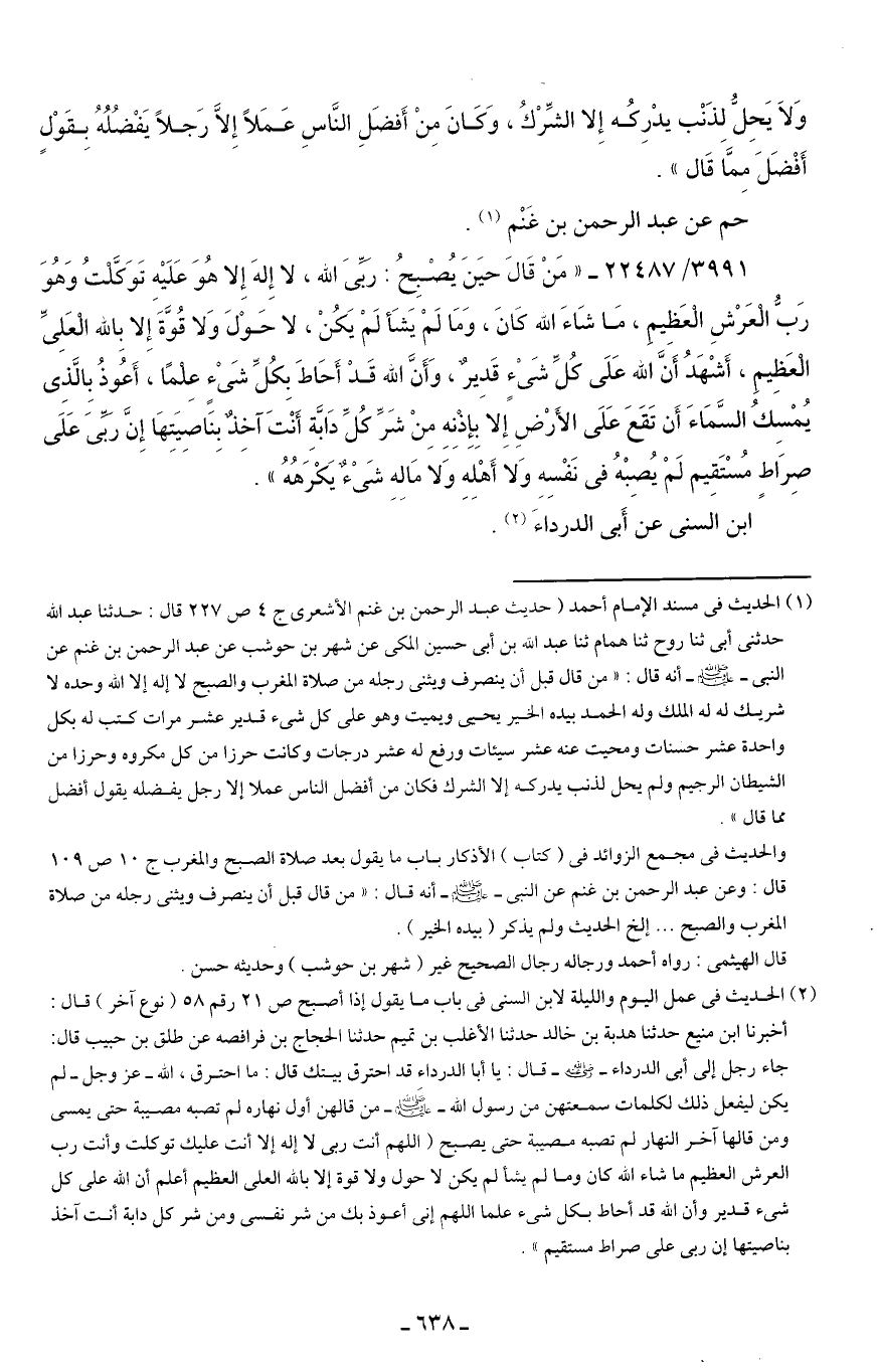 3991/ 22487 - "مَنْ قَال حيَنَ يُصْبِحُ: ربِّي الله، لا إِلهَ إِلا هُوَ عَلَيهِ تَوَكَّلْتُ وَهُوَ رَبُّ الْعَرْشِ الْعَظِيمِ، مَا شَاءَ الله كَانَ، وَمَا لَمْ يَشَأ لَمْ يَكُنْ، لا حَوْلَ وَلا قُوَّةَ إِلا بِالله الْعَلِيِّ الْعَظِيمِ، أَشْهَدُ أَنَّ الله عَلَى كُلِّ شَيْءٍ قَدِيرٌ، وَأَنَّ الله قَدْ أَحَاطَ بِكُلِّ شَيْءٍ عِلْمًا، أَعُوذُ بِالَّذِي يُمْسِكُ السَّمَاءَ أَن تَقَعَ عَلَى الأَرْضِ إِلا بِإِذْنِهِ مِنْ شَرِّ كُلِّ دَابَّةِ أَنْتَ آخِذٌ بِنَاصِيَتِهَا إِنَّ رَبِّي عَلَى صِرَاطٍ مُسْتَقِيم لَمْ يُصِبْهُ في نَفْسِهِ وَلا أَهْلِهِ وَلا مَالِهِ شَيْءٌ يَكْرَهُهُ".