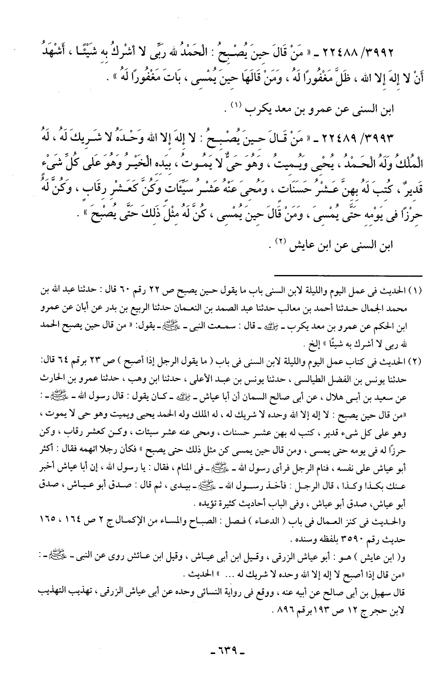 3993/ 22489 - "مَنْ قَال حِينَ يُصْبِحُ: لا إِلهَ إِلا الله وَحْدَهُ لا شَرِيكَ لَهُ، لَهُ الْمُلْكُ وَلَهُ الْحَمْدُ، يُحْيِي وَيُمِيتُ، وَهُوَ حَيٌّ لا يَمُوتُ، بِيَدِهِ الْخَيرُ وَهُوَ عَلى كُلِّ شَيْءٍ قَدِيرٌ، كُتِبَ لَهُ بِهِنَّ عَشْرُ حَسَنَاتٍ، وَمُحِي عَنْهُ عَشْرُ سَيِّئَاتٍ وَكُنَّ كَعَشْرِ رِقَابٍ، وَكُنَّ لَهُ حِرْزًا في يَوْمِهِ حَتَّى يُمْسِي، وَمَنْ قَال حِينَ يُمْسِي، كُنَّ لَهُ مِثْلَ ذَلِكَ حَتَّى يُصْبحَ".