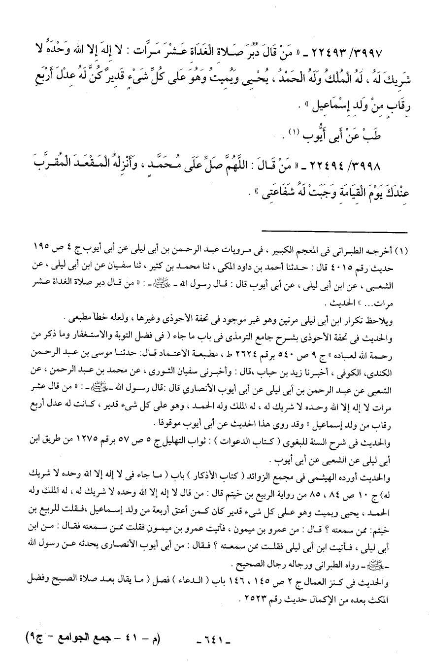 (¬1) أخرجه الطبراني في المعجم الكبير، في مرويات عبد الرحمن بن أبي ليلى عن أبي أيوب ج 4 ص 195 حديث رقم 4015 قال: حدثنا أحمد بن داود المكي، ثنا محمد بن كثير، ثنا سفيان عن ابن أبي ليلى، عن الشعبي، عن ابن أبي ليلى، عن أبي أيوب قال: قال رسول الله - صلى الله عليه وسلم -: "من قال دبر صلاة الغداة عشر مرات ... " الحديث.