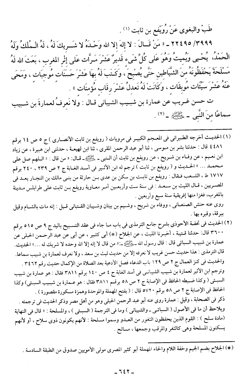 (¬2) الحديث في تحفة الأحوذي بشرح جامع الترمذي في باب ما جاء في عقد التسبيح باليد ج 9 ص 515 برقم 3600 قال: حدثنا قتيبة، أخبرنا الليث، عن الجلاح (*) أبي كثير، عن أبي عن عبد الرحمن الحبلى عن عمارة بن شبيب السبائى قال: قال رسول الله - صَلَّى الله عليه وسلم -: "من قال لا إله إلا الله وحده لا شريك له ... " الحديث.