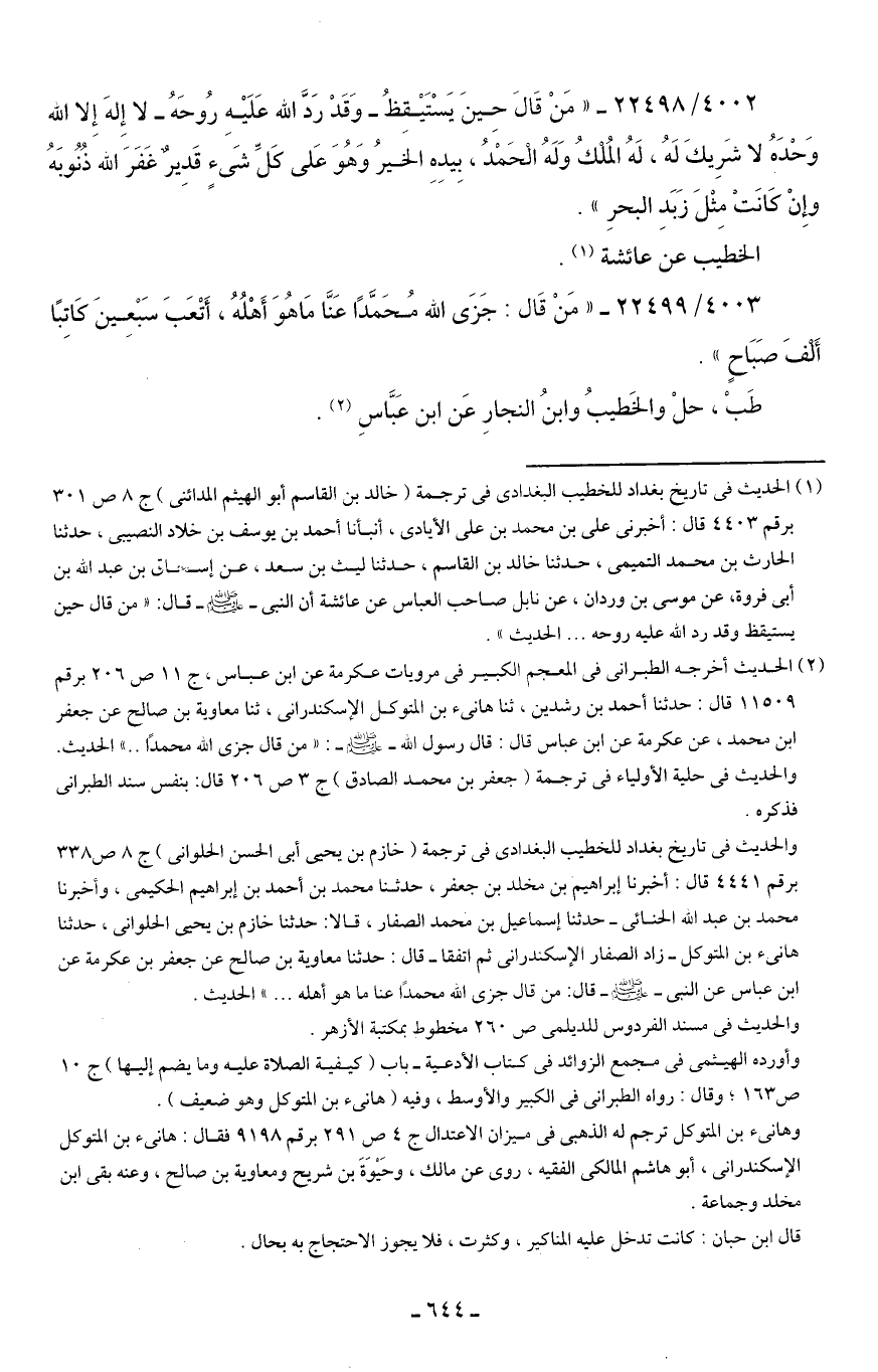 (¬1) الحديث في تاريخ بغداد للخطيب البغدادي في ترجمة (خالد بن القاسم أبو الهيثم المدائني) ج 8 ص 301 برقم 4403 قال: أخبرني علي بن محمد بن علي الأيادى، أنبأنا أحمد بن يوسف بن خلاد النصيبى، حدثنا الحارث بن محمد التميمي، حدثنا خالد بن القاسم، حدثنا ليث بن سعد, عن إسحاق بن عبد الله بن أبي فروة، عن موسى بن وردان، عن نابل صاحب العباس عن عائشة أن النبي - صَلَّى الله عليه وسلم - قال: "من قال حين يستيقظ وقد رد الله عليه روحه ... الحديث".