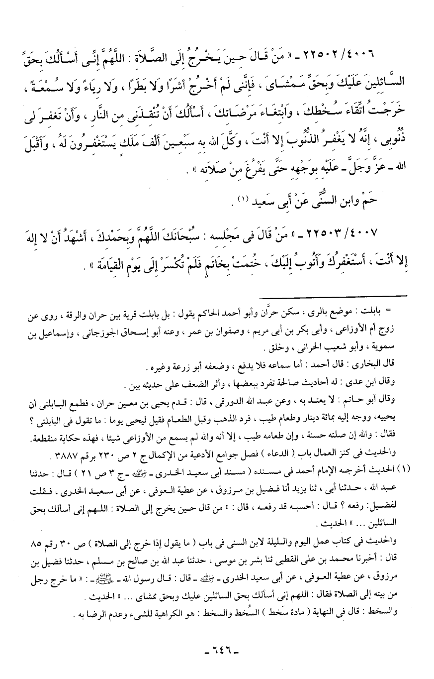 (¬1) الحديث أخرجه الإمام أحمد في مسنده (مسند أبي سعيد الخدري -رضي الله عنه - ج 3 ص 21) قال: حدثنا عبد الله، حدثنا أبي، ثنا يزيد أنا فضيل بن مرزوق، عن عطية العوفى، عن أبي سعيد الخدري، فقلت لفضيل: رفعه؟ قال: أحسبه قد رفعه، قال: "من قال حين يخرج إلى الصلاة: اللهم إني أسألك بحق السائلين ... " الحديث.