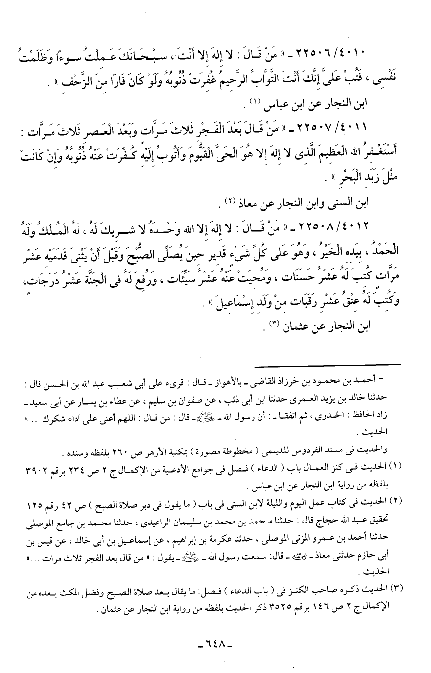 (¬3) الحديث ذكره صاحب الكنز في (باب الدعاء) فصل: ما يقال بعد صلاة الصبح وفضل المكث بعده من الإكمال ج 2 ص 146 برقم 3525 ذكر الحديث بلفظه من رواية ابن النجار عن عثمان.