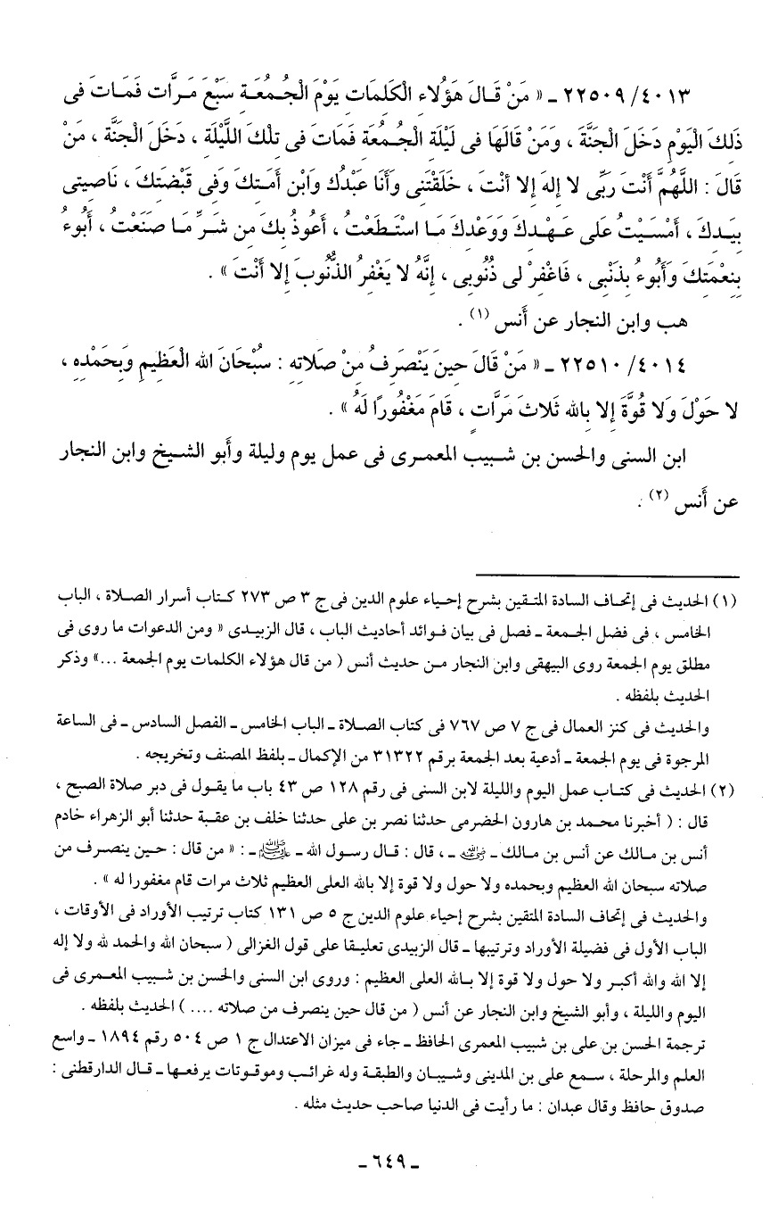 (¬1) الحديث في إتحاف السادة المتقين بشرح إحياء علوم الدين في ج 3 ص 273 كتاب أسرار الصلاة، الباب الخامس، في فضل الجمعة - فصل في بيان فوائد أحاديث الباب، قال الزبيدي "ومن الدعوات ما روى في مطلق يوم الجمعة روى البيهقي وابن النجار من حديث أنس (من قال هؤلاء الكلمات يوم الجمعة ... " وذكر الحديث بلفظه.