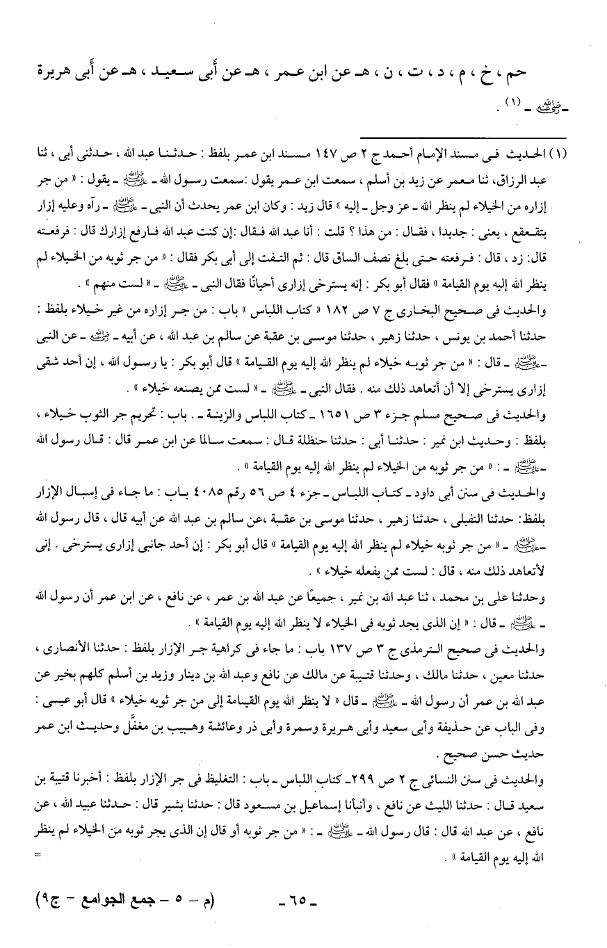 (¬1) الحديث في مسند الإمام أحمد ج 2 ص 147 مسند ابن عمر بلفظ: حدثنا عبد الله، حدثني أبي، ثنا عبد الرزاق، ثنا معمر عن زيد بن أسلم، سمعت ابن عمر يقول: سمعت رسول الله - صلى الله عليه وسلم - يقول: "من جر إزاره من الخيلاء لم ينظر الله - عزَّ وجلَّ - إليه" قال زيد: وكان ابن عمر يحدث أن النبي - صلى الله عليه وسلم - رآه وعليه إزار يتقعقع، يعني: جديدا، فقال: من هذا؟ قلت: أنا عبد الله فقال: إن كنت عبد الله فارفع إزارك قال: فرفعته قال: زد، قال: فرفعته حتى بلغ نصف الساق قال: ثم التفت إلى أبي بكر فقال: "من جر ثوبه من الخيلاء لم ينظر الله إليه يوم القيامة" فقال أبو بكر: إنه يسترخى إزارى أحيانًا فقال النبي - صلى الله عليه وسلم - "لست منهم".
