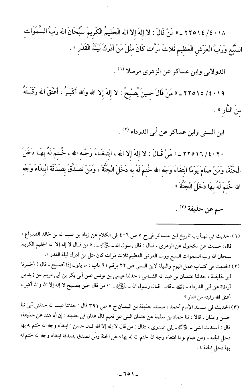 4018/ 22514 - "مَنْ قَال: لا إِلهَ إِلا الله الْحَلِيمُ الْكَرِيمُ سُبْحَانَ الله رَبِّ السَّمَوَاتِ السَّبْعِ وَرَبِّ الْعَرْشِ الْعَظِيم ثَلاثَ مَرَّات كانَ مِثْلَ مَنْ أَدْركَ لَيلَةَ الْقَدْرِ".