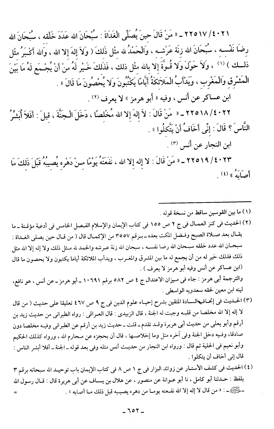 (¬2) الحديث في كنز العمال في ج 2 ص 155 في كتاب الإيمان والإسلام الفصل الخامس في أدعية مؤقتة- ما يقال بعد صلاة الصح وفضل المكث بعده- برقم 3557 من الإكمال قال (من قال حين يصلي الغداة: سبحان الله عدد خلقه سبحان الله رضا نفسه، سبحان الله زنة عرشه والحمد لله مثل ذلك ولا إله إلا الله مثل ذلك فذلك خير له من أن يجمع له ما بين المشرق والمغرب، ويدأب الملائكة أياما يكتبون ولا يحصون ما قال (ابن عساكر عن أنس وفيه أبو هرمز لا يعرف).
