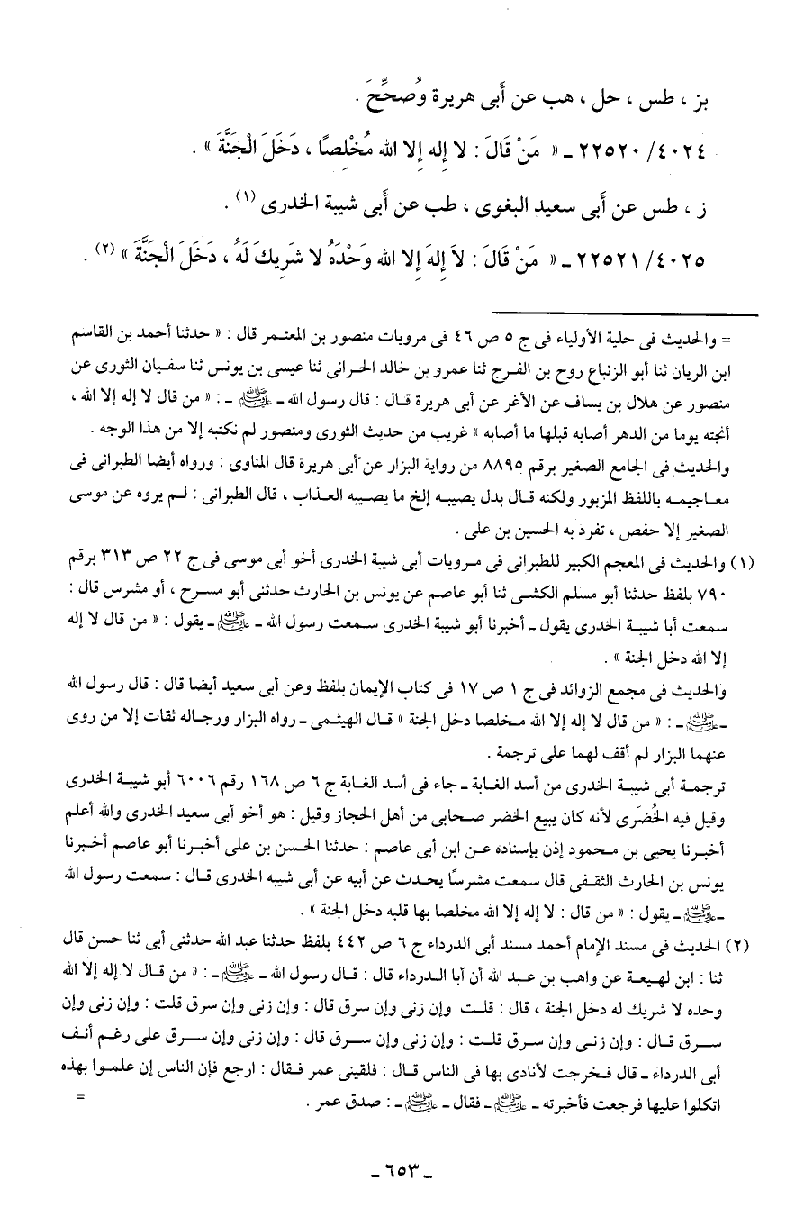 4025/ 22521 - "مَنْ قَال: لَا إِلهَ إِلا الله وَحْدَهُ لا شَرِيكَ لَهُ، دَخَلَ الْجَنَّةَ" (¬2).