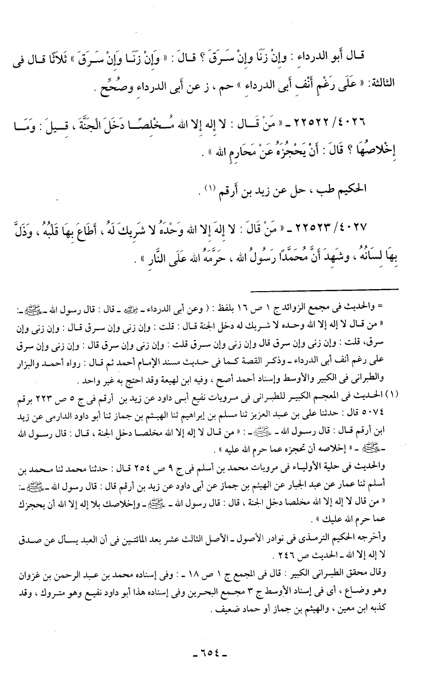 (¬1) الحديث في المعجم الكبير للطبراني في مرويات نفيع أبي داود عن زيد بن أرقم في ج 5 ص 223 برقم 5074 قال: حدثنا علي بن عبد العزيز ثنا مسلم بن إبراهيم ثنا الهيثم بن جماز ثنا أبو داود الدارمي عن زيد بن أرقم قال: قال رسول الله - صلى الله عليه وسلم -: "من قال لا إله إلا الله مخلصا دخل الجنة، قال: قال رسول الله - صلى الله عليه وسلم - "إخلاصه أن تحجزه عما حرم الله عليه".
