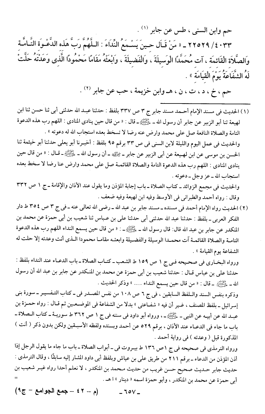 (¬2) الحديث رواه الإمام أحمد في مسنده- مسند جابر بن عبد الله - رضي الله تعالى عنه- في ج 3 ص 354 ط دار الفكر العربي- بلفظ: حدثنا عبد الله حدثني أبي حدثنا علي بن عباس ثنا شعيب بن أبي حمزة عن محمد بن المنكدر عن جابر بن عبد الله قال: قال رسول الله - صلى الله عليه وسلم -: "من قال حين يسمع النداء اللهم رب هذه الدعوة التامة والصلاة القائمة آت محمدا الوسيلة والفضيلة وابعثه مقاما محمودا الذي أنت وعدته إلا حلت له الشفاعة يوم القيامة".