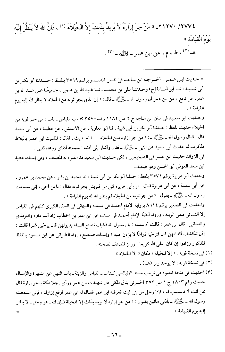 (¬3) الحديث في منحة المعبود في ترتيب مسند الطيالسي كتاب - اللباس والزينة -باب النهي عن الشهرة والإسبال حديث رقم 1803 ج 1 ص 352 أخبرني يناق المكي قال شهدت ابن عمر ورأى رجلا بمكة يجر إزارة قال ممن أنت؟ فانتسب له، فإذا رجل من بني ليث فعرفه ابن عمر فقال له ابن عمر ارفع إزارك، فإني سمعت رسول الله - صلى الله عليه وسلم - بأذني هاتين يقول: "من جر إزاره لا يريد بذلك إلا المخيلة فإن الله - عزَّ وجلَّ - لا ينظر إليه يوم القيامة". =