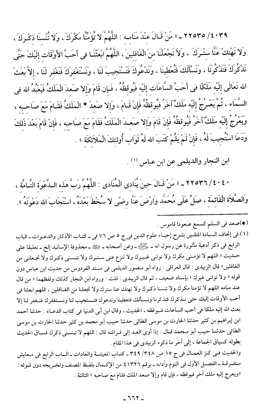 4039/ 22535 - "مَنْ قَال عِنْدَ مَنَامِهِ: اللَّهُمَّ لا تُؤَمِّنَّا مَكْرَكَ، وَلا تُنْسِنَا ذِكْرَكَ، وَلا تَهْتِكْ عَنَّا سِتْرَكَ، وَلَا تَجْعَلنَا مِنَ الْغَافِلِينَ، اللَهُمَّ ابْعَثْنَا في أَحَبِّ الأَوْقَاتِ إِلَيكَ حَتَّى نَذْكُرَكَ فَتَذْكُرَنَا، وَنَسْأَلَكَ فَتُعْطِينَا، وَنَدْعُوكَ فَتَسْتَجِيبَ لَنَا، وَنَسْتَغْفِرَكَ فَتَغْفِر لَنَا، إلا بَعَثَ الله تَعَالى إِلَيهِ مَلَكًا في أَحَبِّ السَّاعَاتِ إِلَيهِ فَيُوقِظُهُ، فَإِن قَامَ وَإِلا صَعِدَ الْمَلَكُ فَيَعْبُدُ الله في السَّمَاءِ، ثُمَّ يَعْرُجُ إِلَيهِ مَلَكٌ آخَرُ فَيُوقِظُهُ فَإِنْ قَامَ، وَإِلا صَعِدَ * الْمَلَكُ فَقَامَ مَعَ صَاحِبِهِ، وَيَعْرُجُ إِلَيهِ مَلَكٌ آخَرُ فَيُوقِظُهُ فَإِنْ قَامَ وَإِلا صَعِدَ الْمَلَكُ فَقَامَ مَعَ صَاحِبِهِ، فَإِنْ قَامَ بَعْدَ ذَلِكَ وَدَعَا اسْتُجِيبَ لَهُ، فَإِنْ لَمْ يَقُمْ كَتَبَ الله لَهُ ثَوَاب أُولئِكَ الْمَلَائِكَةِ".