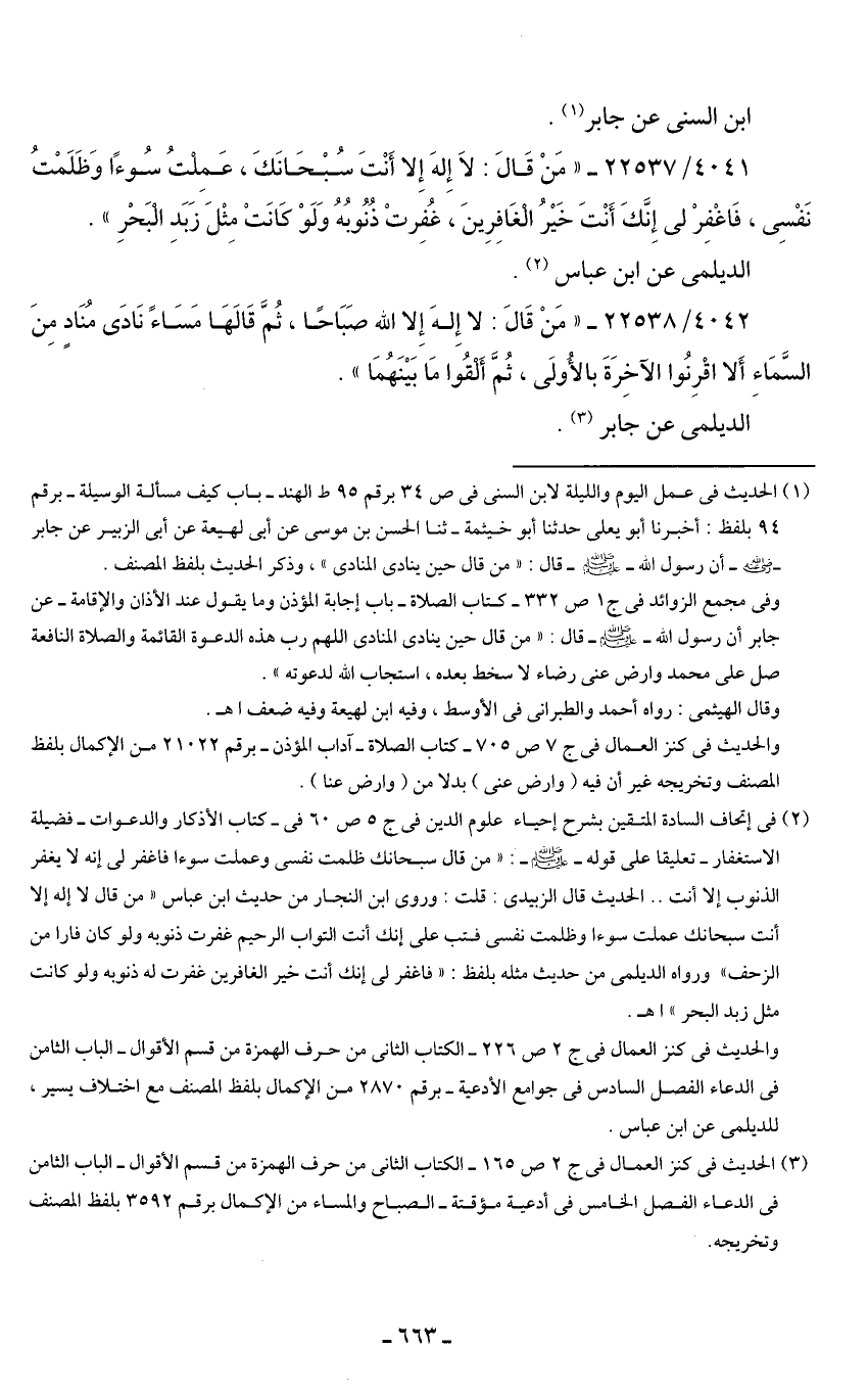 4041/ 225370 - "مَنْ قَال: لَا إِلهَ إِلا أَنْتَ سُبْحَانَكَ، عَمِلْتُ سُوءًا وَظَلَمْتُ نَفْسِي، فَاغْفِرْ لي إِنَّكَ أَنْتَ خَيرُ الْغَافِرِينَ، غُفِرتْ ذُنُوُبهُ وَلَوْ كَانَتْ مِثْلَ زَبَدِ الْبَحْرِ".