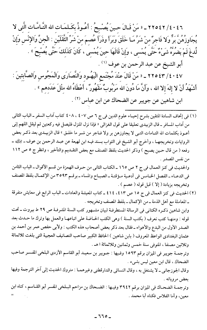 (¬1) في إتحاف السادة المتقين بشرح إحياء علوم الدين في ج 6 ص 407، 408 كتاب آداب السفر -الباب الثاني من آداب المسافر- قال الزبيدي تعليقا على قول الغزالي "فإذا نزل المنزل فليصل فيه ركعتين ثم ليقل اللهم إني أعوذ بكلمات الله التامات التي لا يجاوزهن بر ولا فاجر من شر ما خلق" قال الزبيدي بعد ذكر بعض الروايات وتخريجها، وأخرج أبو الشيخ في الثواب بسند فيه ابن لهيعة عن عبد الرحمن بن عوف - رضي الله عنه - رفعه (من قال حين يصبح) وذكر الحديث بلفظ المصنف مع بعض التقديم والتأخير، وانظر ج 5 ص 112 من نفس المصدر.