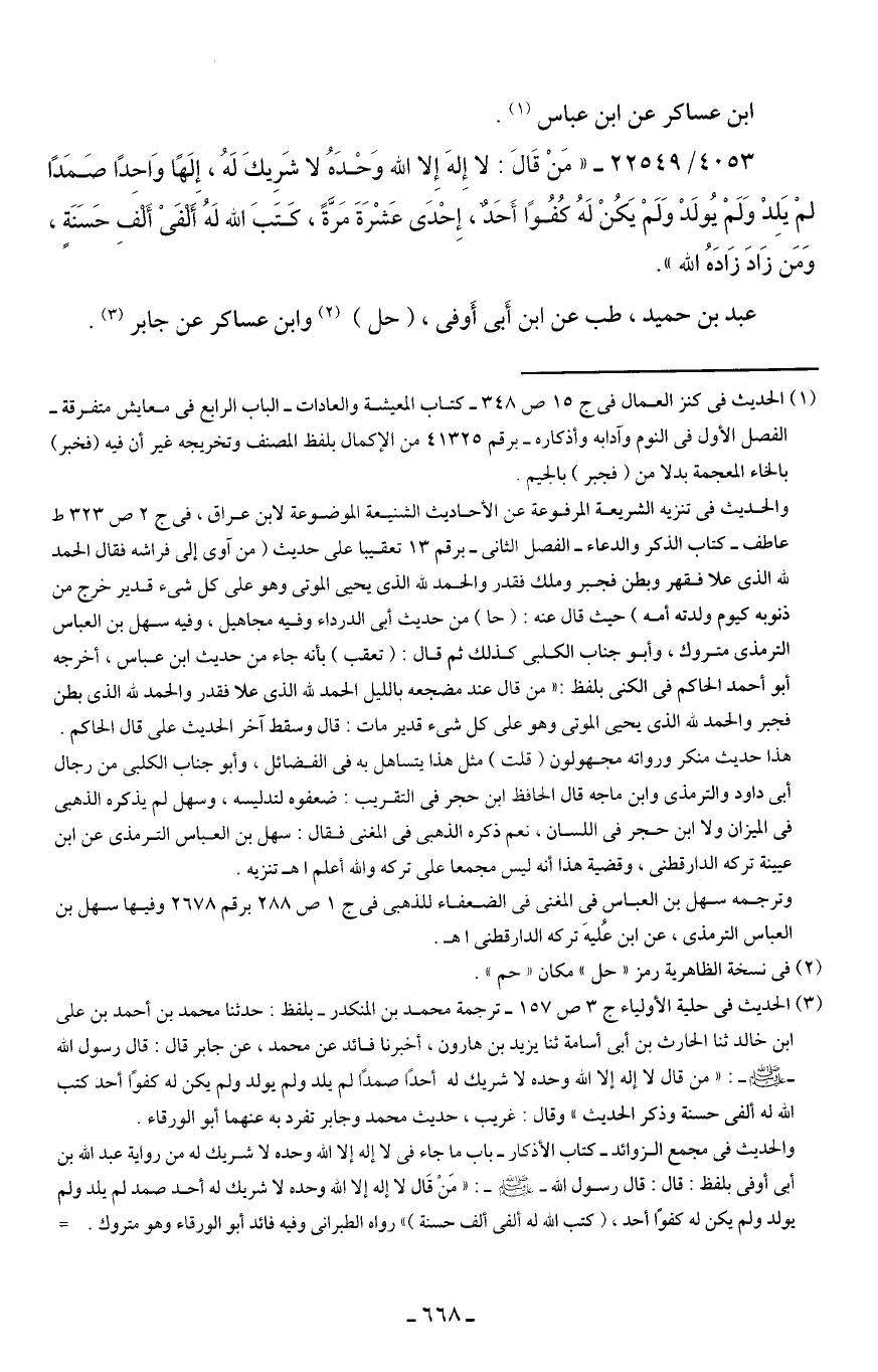 4053/ 22549 - "مَنْ قَال: لا إِلهَ إِلا الله وَحْدَهُ لا شَرِيكَ لَهُ، إِلَهًا وَاحدًا صَمَدًا لمْ يَلِدْ وَلَمْ يُولَدْ وَلَمْ يَكُنْ لَهُ كُفُوًا أَحَدٌ، إِحْدَي عَشْرَةَ مَرَّةً، كَتَبَ الله لَهُ أَلفَي أَلْفَ حَسَنَةٍ، وَمَن زَادَ زَادَهُ الله".