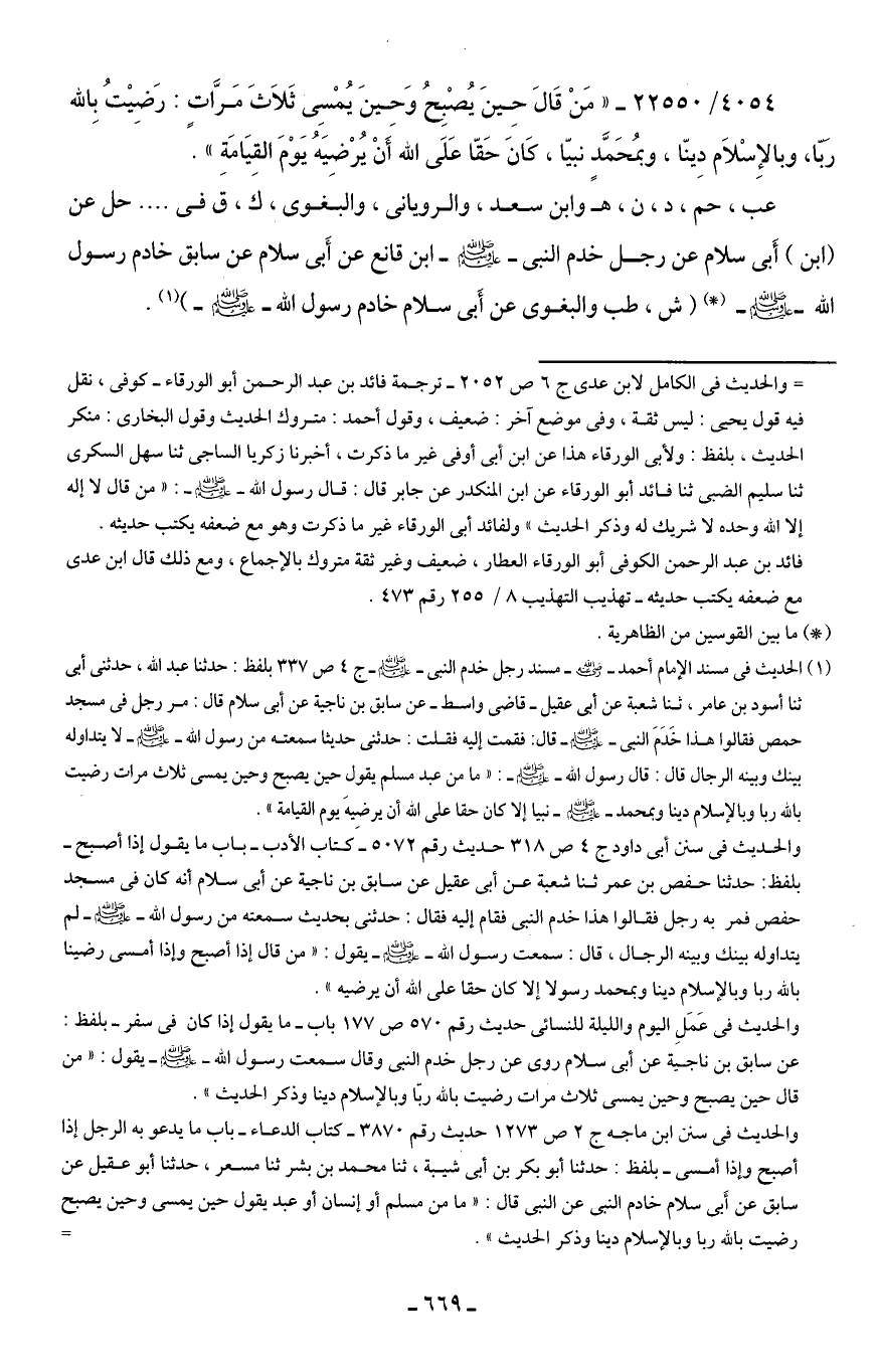 (¬1) الحديث في مسند الإمام أحمد - رضي الله عنه - مسند رجل خدم النبي - صلى الله عليه وسلم - ج 4 ص 337 بلفظ: حدثنا عبد الله، حدثني أبي ثنا أسود بن عامر، ثنا شعبة عن أبي عقيل -قاضي واسط- عن سابق بن ناجية عن أبي سلام قال: مر رجل في مسجد حمص فقالوا هذا خَدَمَ النبي - صلى الله عليه وسلم - قال: فقمت إليه فقلت: حدثني حديثًا سمعته من رسول الله - صلى الله عليه وسلم - لا يتداوله بينك وبينه الرجال قال: قال رسول الله - صلى الله عليه وسلم -: "ما من عبد مسلم يقول حين يصبح وحين يمسي ثلاث مرات رضيت بالله ربا وبالإسلام دينا وبمحمد - صلى الله عليه وسلم - نبيا إلا كان حقا علي الله أن يرضيهَ يوم القيامة".
