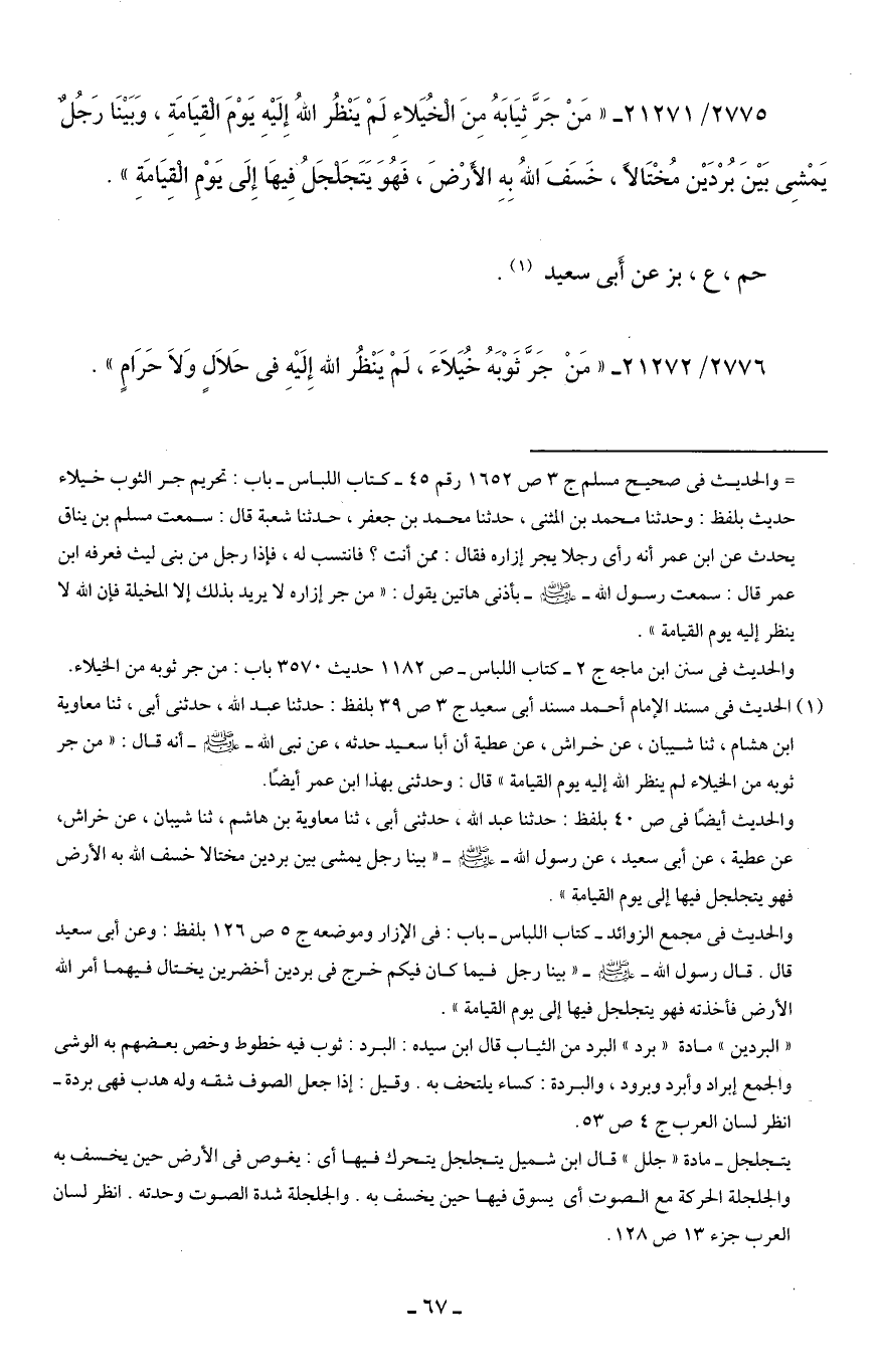 2775/ 21271 - "مَنْ جَرَّ ثِيَابَهُ مِنَ الْخُيَلاءِ لَمْ يَنْظُر اللهُ إِلَيهِ يَوْمَ الْقِيَامَةِ، وَبَينَا رَجُلٌ يَمْشِي بَينَ بُرْدَيْن مُخْتَالًا، خَسَفَ اللهُ بِهِ الأَرْضَ، فَهُوَ يَتَجَلْجَلُ فِيهَا إِلَى يَوْمِ الْقِيَامَةِ".
