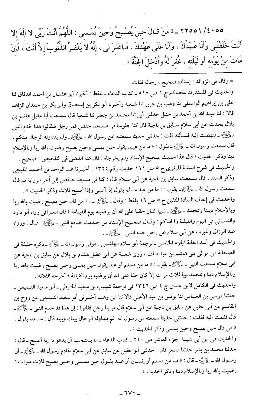 4055/ 22551 - "مَنْ قال حِينَ يُصْبِحُ وَحِينَ يُمْسِي: اللَّهُمَّ أَنْتَ ربِّي لا إِلَهَ إِلا أَنْتَ خَلَقْتَنِي وَأَنَا عَبْدُكَ، وَأَنَا عَلَى عَهْدِكَ، فَاغْفِرْ لِي، إِنَّهُ لا يَغْفرُ الذُّنُوبَ إلا أَنْتَ، فَإِنْ مَاتَ مِنْ يَوْمِهِ أَو لَيلَتِهِ، غُفِرَ لَهُ وَأُدْخِلَ الجَنَّةَ".