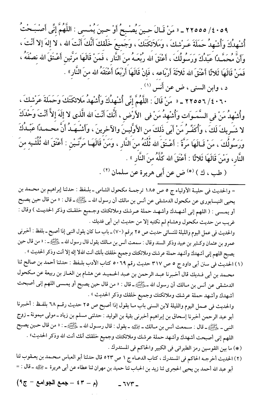 4059/ 22555 - "مَنْ قَال حينَ يُصْبِحُ أَوْ حينَ يُمْسِي: اللَّهُمَّ إِنِّي أَصْبَحْتُ أُشْهدُكَ وَأُشْهِدُ حَمَلَةَ عَرْشِكَ، وَمَلائِكَتَكَ، وَجَمِيعَ خَلْقِكَ أَنَّكَ أَنْتَ الله، لا إِلهَ إلا أَنْتَ، وَأَنَّ مُحَمَّدًا عَبْدُكَ وَرَسُولُكَ، أَعْتَقَ الله رُبْعَهُ مِنَ النَّارِ، فَمَنْ قَالهَا مَرَّتينِ أَعْتَقَ الله نِصْفَهُ، فَمَنْ قَالهَا ثَلاثًا أَعْتَقَ الله ثَلاثَةَ أَرْبَاعِهِ، فَإِنْ قَالهَا أَرْبَعًا أَعْتَقَهُ الله مِنَ النَّارِ".