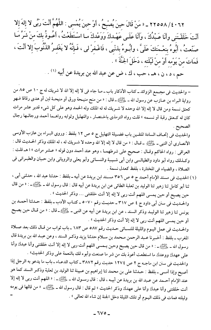 (¬1) الحديث في مسند الإمام أحمد ج 5 ص 356 مسند ابن بريدة عن أبيه- بلفظ: حدثنا عبد الله، حدثني أبي، ثنا أبو كامل ثنا زهير ثنا الوليد بن ثعلبة الطائي عن ابن بريدة عن أبيه قال: قال رسول الله - صلى الله عليه وسلم -: "من قال حين يصبح أو حين يمسي اللهم أنت ربي لا إله إلا أنت خلقتني ... وذكر الحديث".