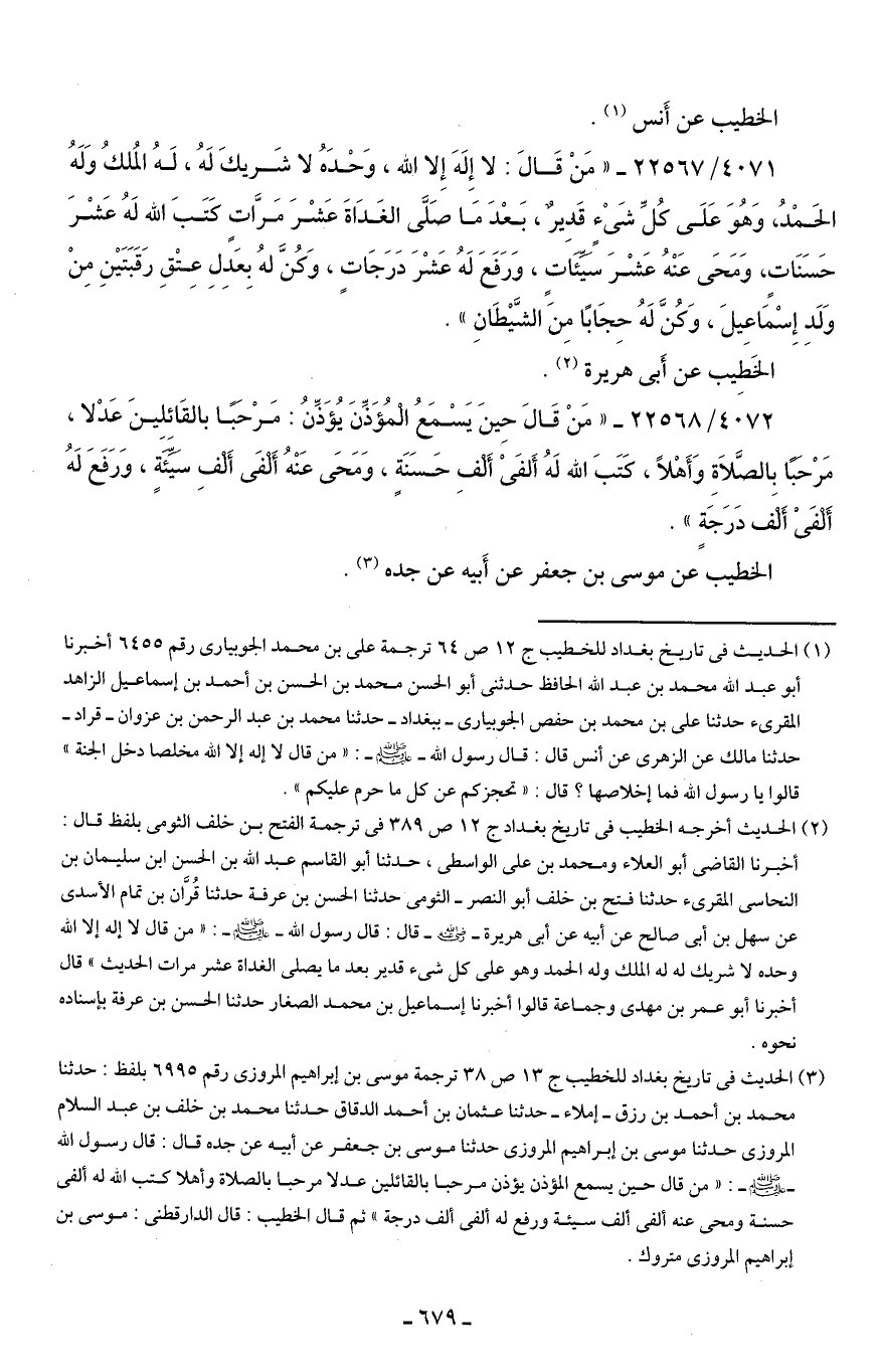 (¬2) الحديث أخرجه الخطيب في تاريخ بغداد ج 12 ص 389 في ترجمة الفتح بن خلف الثومي بلفظ قال: أخبرنا القاضي أبو العلاء ومحمد بن علي الواسطي، حدثنا أبو القاسم عبد الله بن الحسن بن سليمان بن النحاسي المقريء حدثنا فتح بن خلف أبو النصر -الثومي حدثنا الحسن بن عرقة حدثنا قُرَّان بن تمام الأسدي عن سهل بن أبي صالح عن أبيه عن أبي هريرة - صلى الله عليه وسلم - قال: قال رسول الله - صلى الله عليه وسلم -: "من قال لا إله إلا الله وحده لا شريك له له الملك وله الحمد وهو على كل شيء قدير بعد ما يصلي الغداة عشر مرات الحديث" قال أخبرنا أبو عمر بن مهدي وجماعة قالوا أخبرنا إسماعيل بن محمد الصغار حدثنا الحسن بن عرفة بإسناده نحوه.