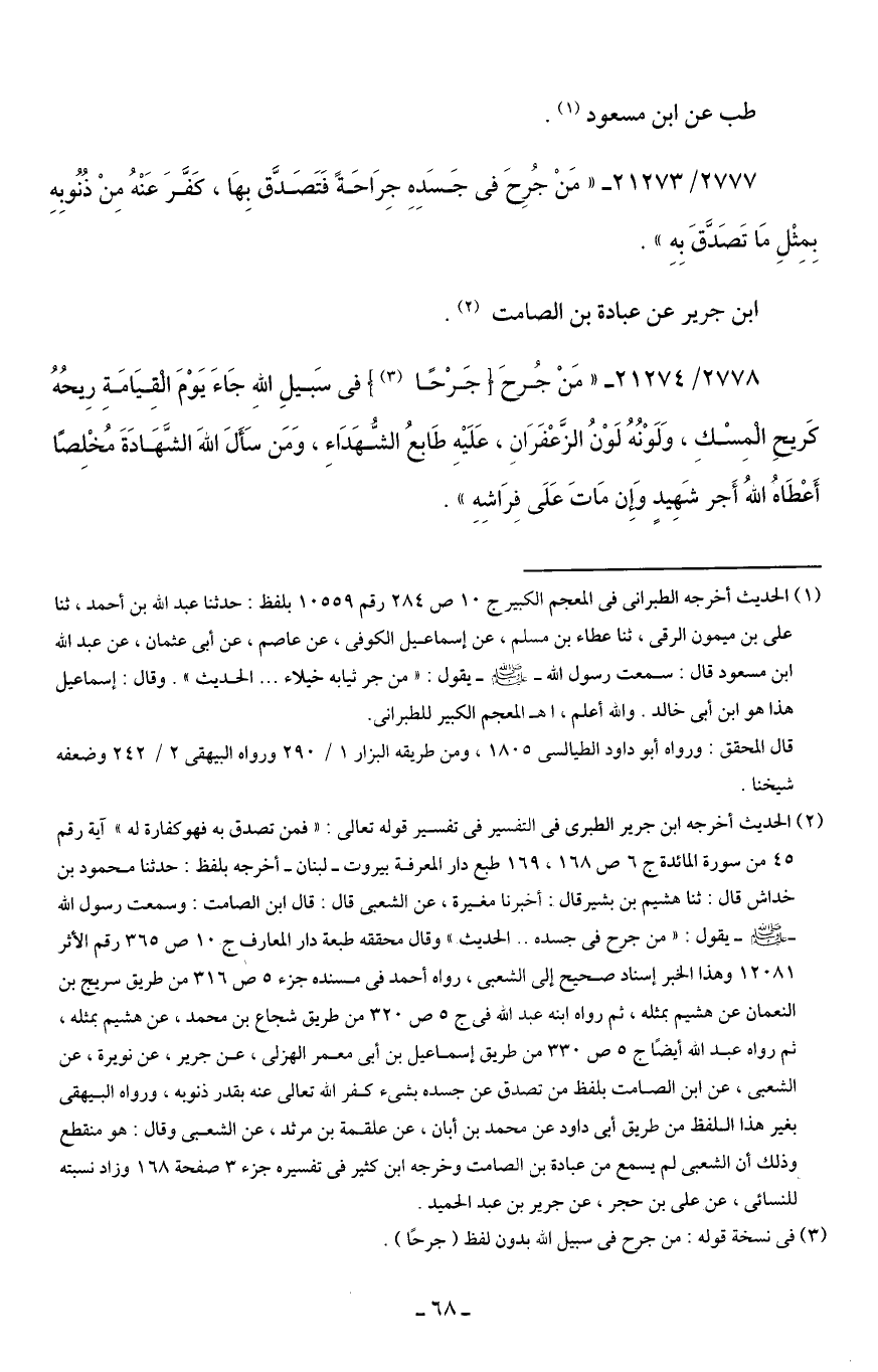 (¬2) الحديث أخرجه ابن جرير الطبري في التفسير في تفسير قوله تعالى: {فَمَنْ تَصَدَّقَ بِهِ فَهُوَ كَفَّارَةٌ لَهُ} آية رقم 45 من سورة المائدة ج 6 ص 168، 169 طبع دار المعرفة بيروت - لبنان - أخرجه بلفظ: حدثنا محمود بن خداش قال: ثنا هشيم بن بشير قال: أخبرنا مغيرة، عن الشعبي قال: قال ابن الصامت: وسمعت رسول الله - صلى الله عليه وسلم - يقول: "من جرح في جسده .. الحديث" وقال محققه طبعة دار المعارف ج 10 ص 365 رقم الأثر 12081 وهذا الخبر إسناد صحيح إلى الشعبي، رواه أحمد في مسنده جزء 5 ص 316 من طريق سريج بن النعمان عن هشيم بمثله، ثم رواه ابنه عبد الله في ج 5 ص 320 من طريق شجاع بن محمد، عن هشيم بمثله، ثم رواه عبد الله أيضًا ج 5 ص 330 من طريق إسماعيل بن أبي معمر الهزلى، عن جرير، عن نويرة، عن الشعبي، عن ابن الصامت بلفظ من تصدق عن جسده بشيء كفر الله تعالى عنه بقدر ذنوبه، ورواه البيهقي بغير هذا اللفظ من طريق أبي داود عن محمد بن أبان، عن علقمة بن مرثد، عن الشعبي وقال: هو منقطع وذلك أن الشعبي لم يسمع من عبادة بن الصامت وخرجه ابن كثير في تفسيره جزء 3 صفحة 168 وزاد نسبته للنسائى، عن علي بن حجر، عن جرير بن عبد الحميد.